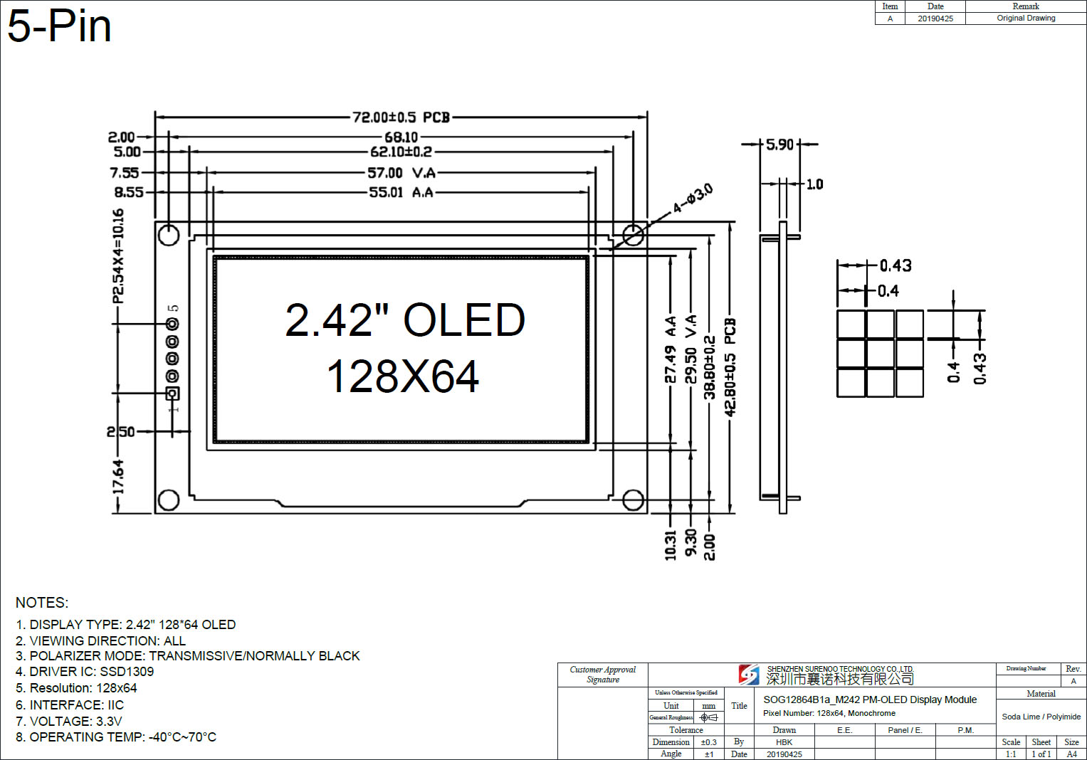 Gross Weight 0.040Kg Manufacturer Surenoo Display Type Graphic OLED Module Continuity Supply More than 10 years Part No. SOG12864B1a_M242 Diagonal Size (Visual Area) 2.42" Display Format 128*64 Dots Interface Serial IIC IC or Equivalent SSD1309 or Equal Voltage(Type) 3.3-5.0V Outline Dimension 72.00(W)x42.80(H)x5.90(T)mm Visual Area 57.01x29.49mm Active Area 55.01x27.49mm Dots Size 0.40x0.40mm Dots Pitch 0.43x0.43mm Display Type PM-OLED Panel Colors Code White(SOGW) / Yellow(SOGY) / Green(SOGG) / Blue(SOGB) IC Package COG Viewing Direction Full Viewing Angle Operating Temperature -40℃~70℃ Storage Temperature -40℃~90℃ - Outline Drawing (SOG12864B1b_M242)