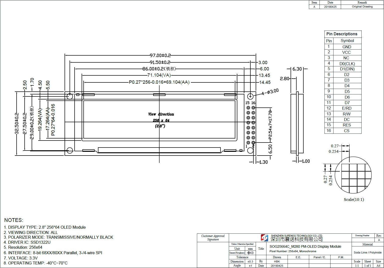 Gross Weight 0.060Kg Manufacturer Surenoo Display Type Graphic OLED Module / Graphic OLED Panel Continuity Supply More than 10 years Part No. SOG25664C Diagonal Size (Visual Area) 2.8" Display Format 256*64 Dots Interface 8-bit 68XX/80XX Parallel, 3-/4-wire SPI IC or Equivalent SSD1322 or Equal Voltage(Type) 3.3V Outline Dimension SOG25664C_M280: 97.00(W)x32.50(H)x6.30(T)mm (OLED Module) SOG25664C_P280: 84.00(W)x25.80(H)x2.00(T)mm (OLED Panel) Visual Area 71.104x19.264mm Active Area 69.104x17.264mm Dots Size 0.27x0.27mm Dots Pitch 0.254x0.254mm Display Type PM-OLED Panel Colors Code SOGW(White) / Green(SOGG) / Blue(SOGB) IC Package COF Viewing Direction Full Viewing Angle Operating Temperature-40℃~70℃Storage Temperature-40℃~80℃- Outline Drawing