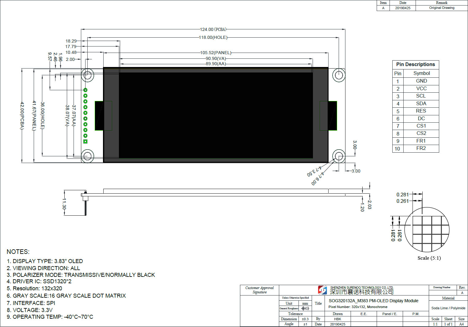 Gross Weight 0.080Kg Manufacturer Surenoo Display Type Graphic OLED Module / Graphic OLED Panel Continuity Supply More than 10 years Part No. SOG320132A_M383 / SOG320132A_P383 Diagonal Size (Visual Area) 3.83" Display Format 320*132 Dots Interface 4-Wire Serial SPI IC or Equivalent SSD1320 X2 or Equal Voltage(Type) 3.3V Outline Dimension SOG320132A_M383, 124.00(W)x42.00(H)x3.23(T)mm (OLED Module) SOG320132A_P383, 105.52(W)x41.67(H)x2.03(T)mm (OLED Panel) Visual Area 90.90x38.07mm Active Area 89.90x37.07mm Dots Size 0.281x0.281mm Dots Pitch 0.261x0.261mm Display Type PM-OLED Panel Colors Code White IC Package COG Viewing Direction Full Viewing Angle Operating Temperature-40℃~70℃Storage Temperature-40℃~80℃- Outline Drawing