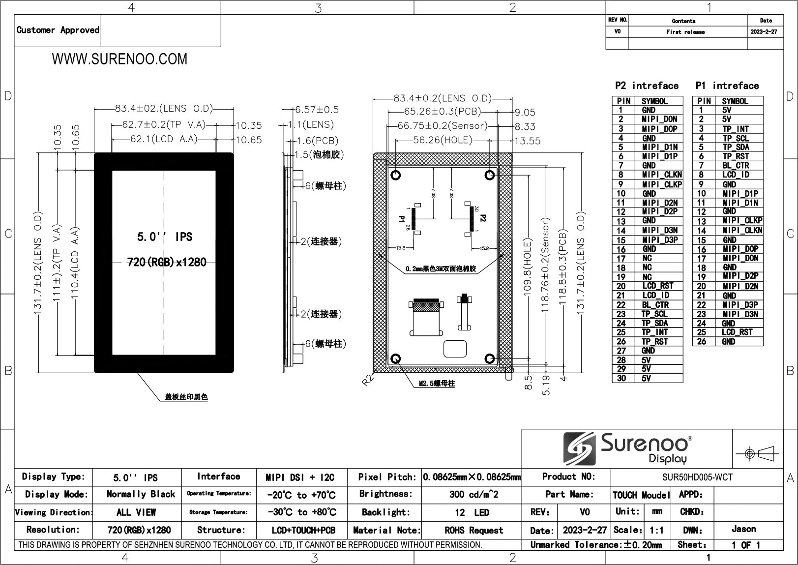 Item of General Information Contents Unit LCD Display Size (Diagonal) 5.0 Inch LCD Display Type TFT/TRANSMISSIVE - LCD Display Mode Normally Black - Recommended Viewing Direction ALL VIEW (IPS) O'Clock Model No. SDSO050A_7201280 - MPN No. SUR50HD005-WCT - LCM Module Size (W×H×T) 83.40×131.70×6.57 MM Active Area (W×H) 62.10×110.40 MM Number of Pixels (Resolution) 720(RGB)×1280 Pixel Pixel Pitch (W×H) 0.08625×0.08625 MM Color Pixel Arrangement RGB Stripe - LCD Driver IC ILI9881 - Interface Type MIPI 4 Lane - Color Numbers 16.7M - Backlight Type White LED - Touch Type Capacitive Touch Panel (CTP) -- CTP Surface Hardness 6H - CTP Transparency ≥82% - CTP Driver IC GT911 - CTP Interface IIC - CTP Support Points 5 - - External Dimensions