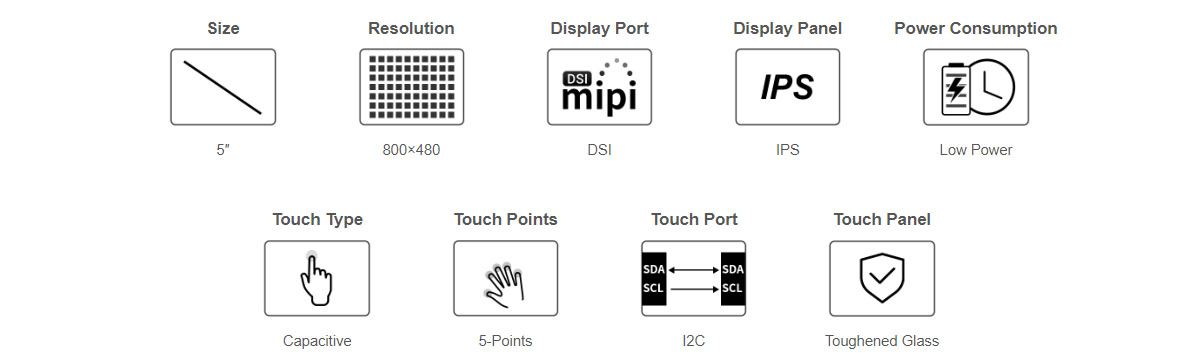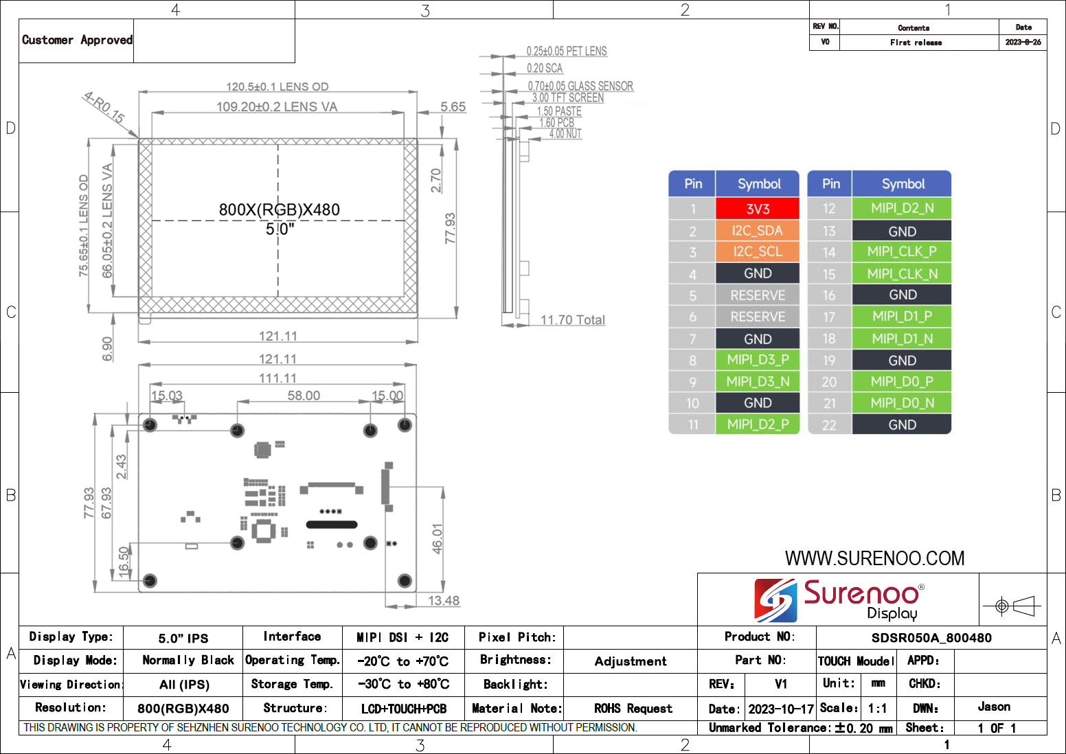 Item of General Information Contents Unit LCD Display Size (Diagonal) 5.0" Inch LCD Display Type TFT/TRANSMISSIVE - LCD Display Mode Normally Black - Recommended Viewing Direction ALL VIEW (IPS) O'Clock Model No. SDSR050A_800480 - LCM Module Size (W×H×T) 120.50×77.93×11.70 MM Viewing Area (W×H) 109.20×66.05 MM Active Area (W×H) 108.00×64.80 MM Number of Pixels (Resolution) 800(RGB)×480 - Color Pixel Arrangement RGB Stripe - Interface Type MIPI 4 Lane - Color Numbers 16.7M - Backlight Type White LED - Touch Type Capacitive Touch Panel (CTP) -- - External Dimensions & Interface