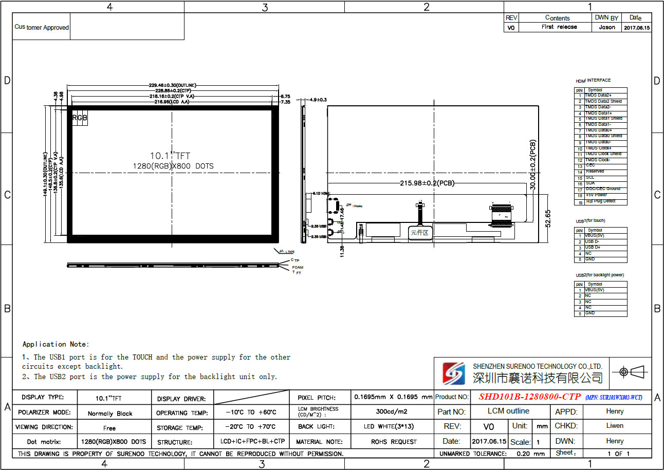 Item of General Information Contents Unit LCD Display Size (Diagonal) 10.1" Inch LCD Display Type TFT/TRANSMISSIVE - LCD Display Mode Normally Black - Recommended Viewing Direction IPS Full Angle O'Clock Model No. SHD101B-1280800-CTP / SHD101B-1280800-LTP - Resolutions 1280(RGB)*800 - Video Input Interface HDMI - Power Supply Double Micro USB 5.0V Touch Type USB 5-Points Capacitive Touch Panel (CTP/LTP) - Backlight Type White LED - Luminance(TYP) 300 CD/M2 LCM Module Size (W×H) CTP: 229.46×149.10 / LTP: 255.00×172.60 MM Active Area (W×H) 216.96×135.60 MM