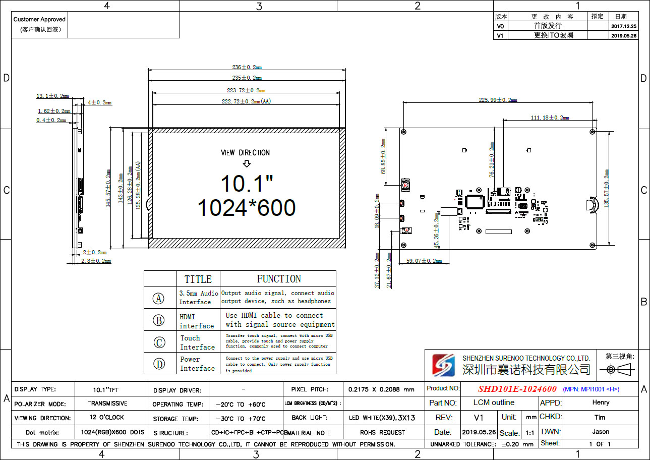 Item of General Information Contents Unit LCD Display Size (Diagonal) 10.1" Inch LCD Display Type TFT/TRANSMISSIVE - LCD Display Mode Normally Black - Recommended Viewing Direction IPS Full Angle O'Clock Model No. SHD101E-1024600 - Resolutions 1024(RGB)*600 - Video Input Interface HDMI - Power Supply Double Micro USB 5.0V Touch Type USB 5-Points Capacitive Touch Panel - Backlight Type White LED - Luminance(TYP) 300 CD/M2 LCM Module Size (W×H) 236.00×145.57 MM Active Area (W×H) 222.72×125.28 MM - External Dimensions