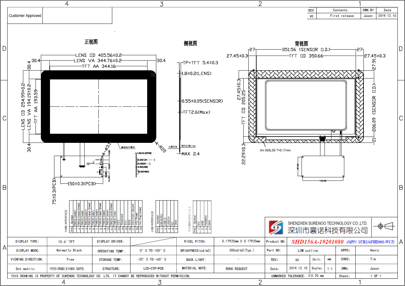 Item of General Information Contents Unit LCD Display Size (Diagonal) 15.6" Inch LCD Display Type TFT/TRANSMISSIVE - LCD Display Mode Normally Black - Recommended Viewing Direction ALL VIEW (IPS) O'Clock Model No. SHD156A-19201080 - Resolutions 1920(RGB)*1080 - Video Input Interface HDMI Type A - Power Supply DC IN 12V (3.5*1.5MM) / ATX Plug In 12V - Touch Type Micro-USB 5-Points Capacitive Touch Panel (CTP) - Touch Controller - - Backlight Type White LED - Luminance(TYP) 300 CD/M2 LCM Module Size (W×H) 405.56×254.99 MM Active Area (W×H) 344.16×193.59 MM - External Dimensions