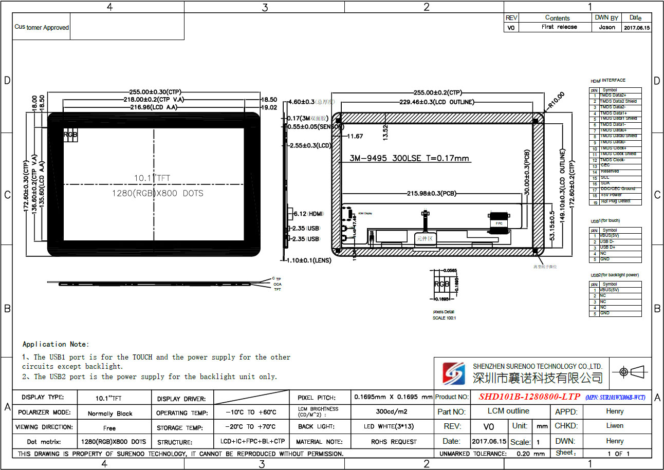 Item of General Information Contents Unit LCD Display Size (Diagonal) 10.1" Inch LCD Display Type TFT/TRANSMISSIVE - LCD Display Mode Normally Black - Recommended Viewing Direction IPS Full Angle O'Clock Model No. SHD101B-1280800-CTP / SHD101B-1280800-LTP - Resolutions 1280(RGB)*800 - Video Input Interface HDMI - Power Supply Double Micro USB 5.0V Touch Type USB 5-Points Capacitive Touch Panel (CTP/LTP) - Backlight Type White LED - Luminance(TYP) 300 CD/M2 LCM Module Size (W×H) CTP: 229.46×149.10 / LTP: 255.00×172.60 MM Active Area (W×H) 216.96×135.60 MM