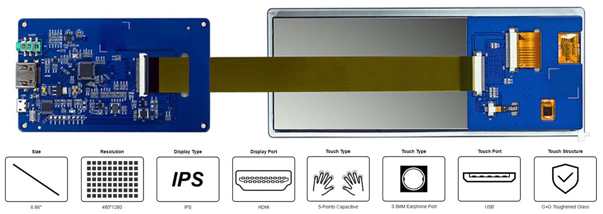 Surenoo HDMI Display 6.86" inch 480*1280 IPS LCD Display Module Screen Monitor with USB Large Capacitive Touch Panel CTP LTP for Windows Win11 RaspBerry Pi 4B/5