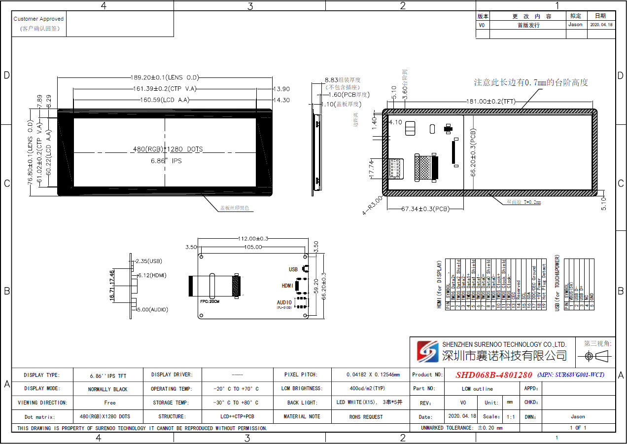Item of General Information Contents Unit LCD Display Size (Diagonal) 6.86" Inch LCD Display Type TFT/TRANSMISSIVE - LCD Display Mode Normally Black - Recommended Viewing Direction IPS Full Angle O'Clock Model No. SHD068B-4801280 - Resolutions 480(RGB)*1280 - Video Input Interface HDMI - Power Supply Micro USB 5.0V - Touch Type USB 5-Points Large Capacitive Touch Panel (LTP) - Backlight Type White LED - Luminance(TYP) 400 CD/M2 LCM Module Size (W×H) 189.20×76.80 MM Active Area (W×H) 160.59×60.22 MM - External Dimensions