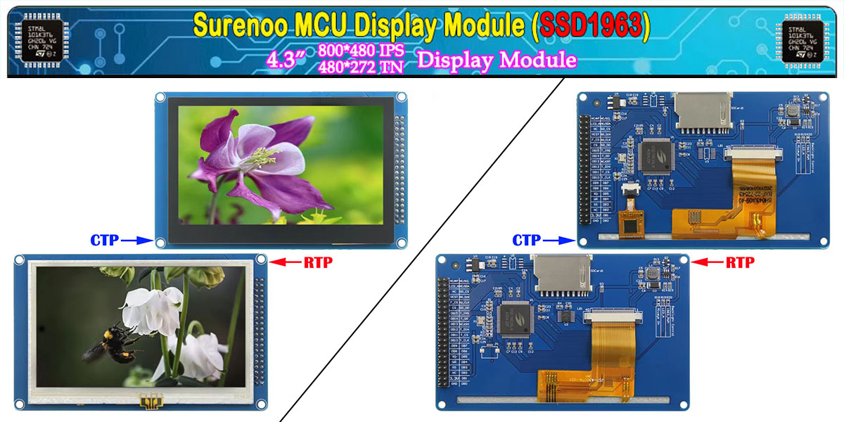Surenoo SSD1963 MCU Display 4.3" inch 800*480 IPS / 480*272 TN MCU Parallel Interface LCD Display Module Screen Panel Resistive / Capacitive Touch Panel CTP / RTP Optional for STM32 ARM 51 Development Board