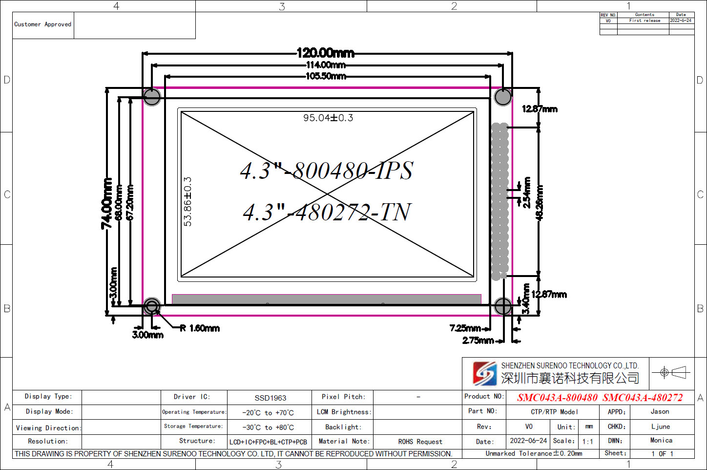 Item of General Informatio Contents Unit LCD Display Size (Diagonal) 4.3 Inch Recommended Viewing Angle 480*272 6:00 O'Clock (TN) / 800*480 IPS Full View Angle O'Clock Model No. SMC043A-800480 (IPS) / SMC043A-480272 (TN) - MPN No. - - LCM Module Size (W×H×T) 120.00×74.00 MM Active Area (W×H) 95.04×53.86 MM Number of Pixels (Resolution) 480(RGB)×272 / 800(RGB)×480 Pixels Pixel Pitch (W×H) - MM Color Pixel Arrangement RGB Stripe - LCD Driver IC SSD1963 - Interface Type MCU 16-/8-bit Parallel - Color Numbers 16.7M - Backlight Type White LED - - External Dimensions