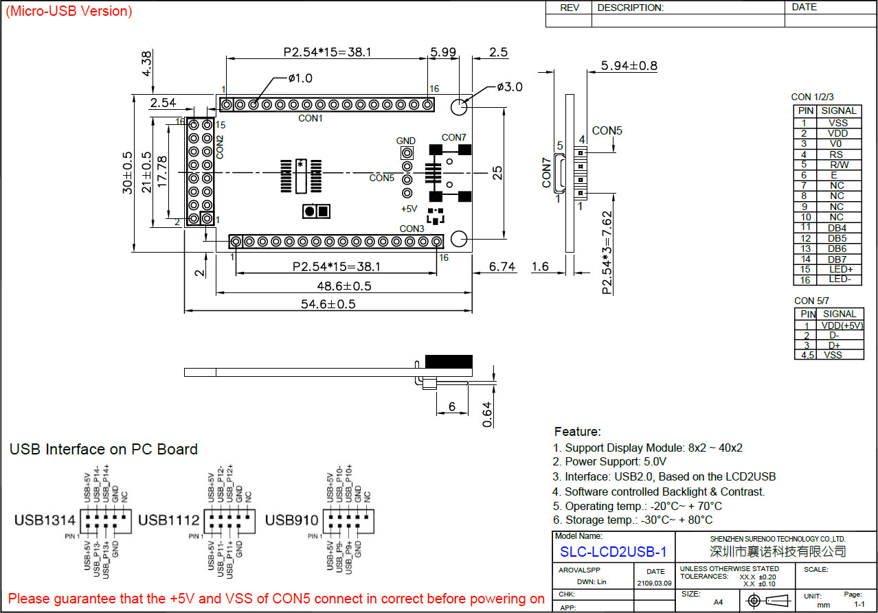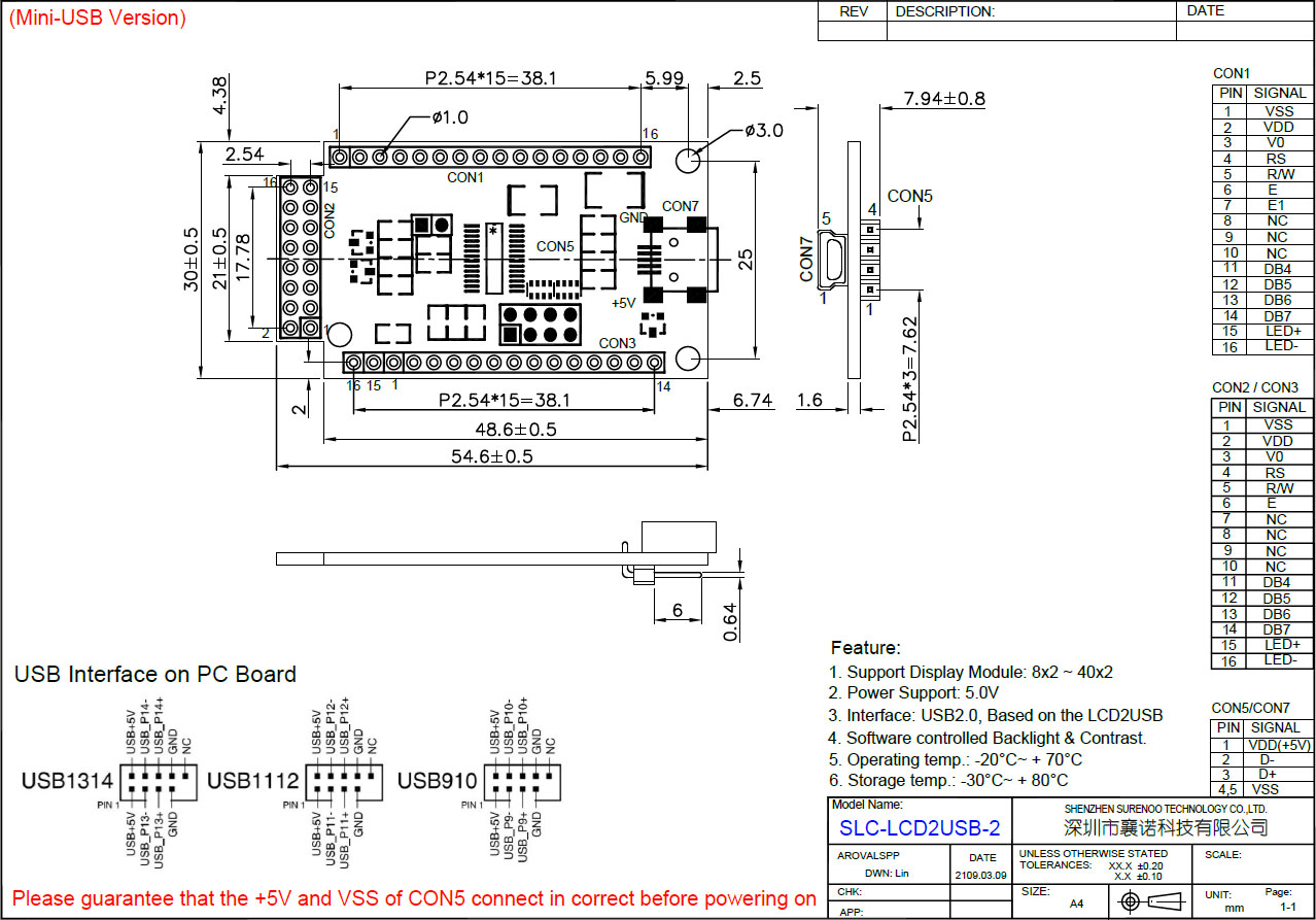 Gross Weight 0.0240Kg Manufacturer Surenoo Continuity Supply More than 10 years Part No. LCD2USB Module Display Support All Stanard Character LCD Display Interface 1X16P/2.54; 2X8P/2.54 6800 4-Bit Parallel, USB Interface Voltage(Type) 5.0V in default Software LCD Smartie; AIDA64 Operating Temperature-20℃~70℃Storage Temperature-30℃~80℃- Outline Drawing