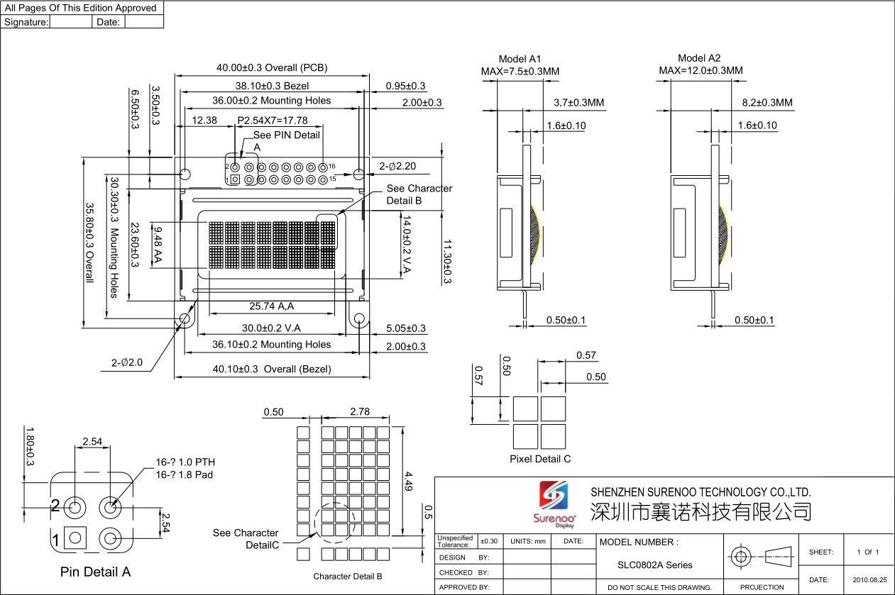 Gross Weight 0.025Kg Manufacturer Surenoo Display Type Graphic LCD Module / IIC Display Continuity Supply More than 10 years Part No. SLC0802A Display Format 8x2 Characters Interface 6800 4-bit Parallel, 6800 8-bit Parallel, Serial IIC IC or Equivalent AIP31066, ST7066 or Equal Fonts English-Japanese Other Fonts is Optional for Bulk Order. Voltage(Type) 5.0V in default, 3.3V is Optional Connection 2*8P/2.54 Pin Header Outline Dimensio A1: 40.00(W)x35.80(H)x7.50(T)mm / A2: 40.00(W)x35.80(H)x12.00(T)mm Visual Area 30.00x14.00mm Active Area 25.74x9.48mm Display Type STN LCD-Yellow Green, STN Blue Negative Backlight Type (LED) Yellow Green, White IC Package COB Viewing Direction 6:00 O'Clock Operating Temperature-20℃~70℃Storage Temperature-30℃~80℃- Outline Drawing
