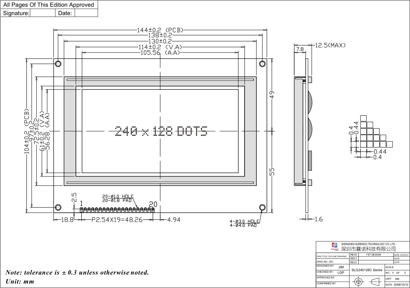Gross Weight 0.200Kg Manufacturer Surenoo Display Type Graphic LCD Module Continuity Supply More than 10 years Part No. SLG240128C (4.7") Display Format 240*128 Dots Interface 8080 8-Bit Parallel IC or Equivalent RA6963 or Equal Voltage 5.0V in default Connection 1X20P/2.54 Pin Header Outline Dimension 144.00(W)x104.00(H)x12.50(T)mm Visual Area 114.00x61.00mm Active Area 105.56x56.28mm Display Type STN Yellow Green, STN Blue Negative Backlight Type (LED) Yellow Green, White IC Package COB Viewing Direction 6:00 O'Clock Operating Temperature -20℃~70℃ Storage Temperature -30℃~80℃ - Outline Drawing