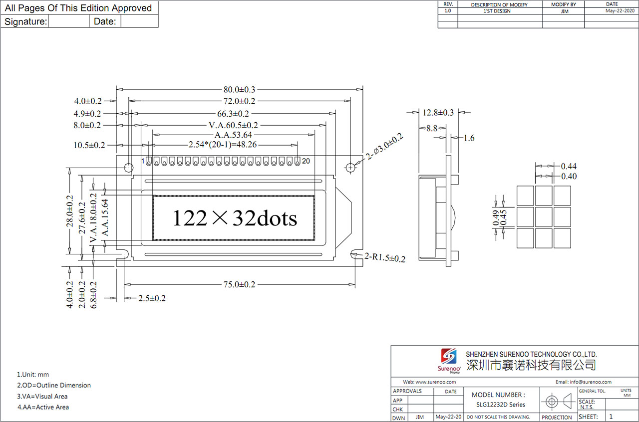 Gross Weight 0.040Kg Manufacturer Surenoo Display Type Graphic LCD Module Continuity Supply More than 10 years Part No. SLG12232D (2.0") Display Format 122*32 Dots Interface 6800 4-bit Parallel, 6800 8-bit Parallel IC or Equivalent SED1520, SBN1661, AIP31520 or Equal Voltage 5.0V in default Connection 1X20P/2.54 Pin Header Outline Dimension 80.00(W)x36.00(H)x12.80(T)mm Visual Area 60.50x18.00mm Active Area 53.64x15.64mm Display Type STN Yellow Green, STN Blue Negative, FSTN Positive Backlight Type (LED) Yellow Green, White IC Package COB Viewing Direction 6:00 O'Clock Operating Temperature-20℃~70℃Storage Temperature-30℃~80℃- Outline Drawing