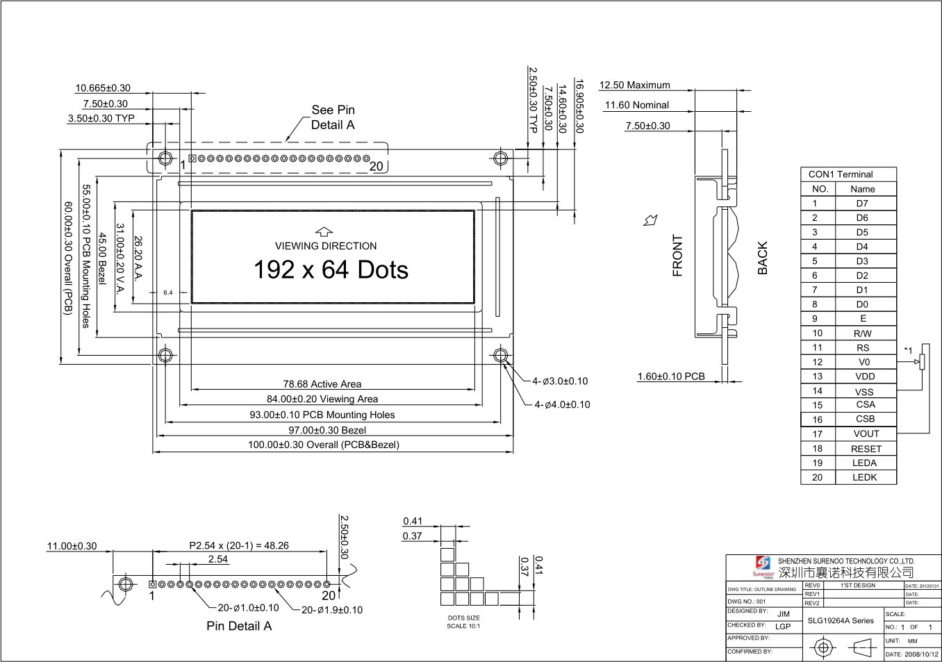 Gross Weight 0.080Kg Manufacturer Surenoo Display Type Graphic LCD Module Continuity Supply More than 10 years Part No. SLG19264A (3.2") Display Format 192*64 Dots Interface 6800 4-bit Parallel, 6800 8-bit Parallel IC or Equivalent KS0108, AIP31108 or Equal Voltage 5.0V in default Connection 1X20P/2.54 Pin Header Outline Dimension 100.00(W)x60.00(H)x12.50(T)mm Visual Area 84.00x31.00mm Active Area 78.68x26.20mm Display Type STN Yellow Green, STN Blue Negative Backlight Type (LED) Yellow Green, White IC Package COB Viewing Direction 6:00 O'Clock Operating Temperature-20℃~70℃Storage Temperature-30℃~80℃- Outline Drawing