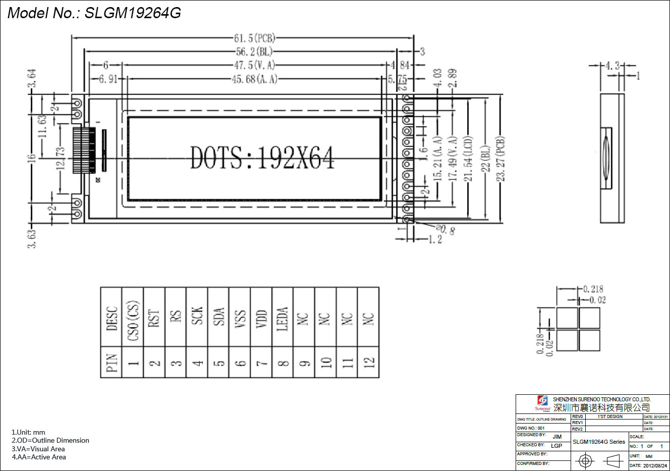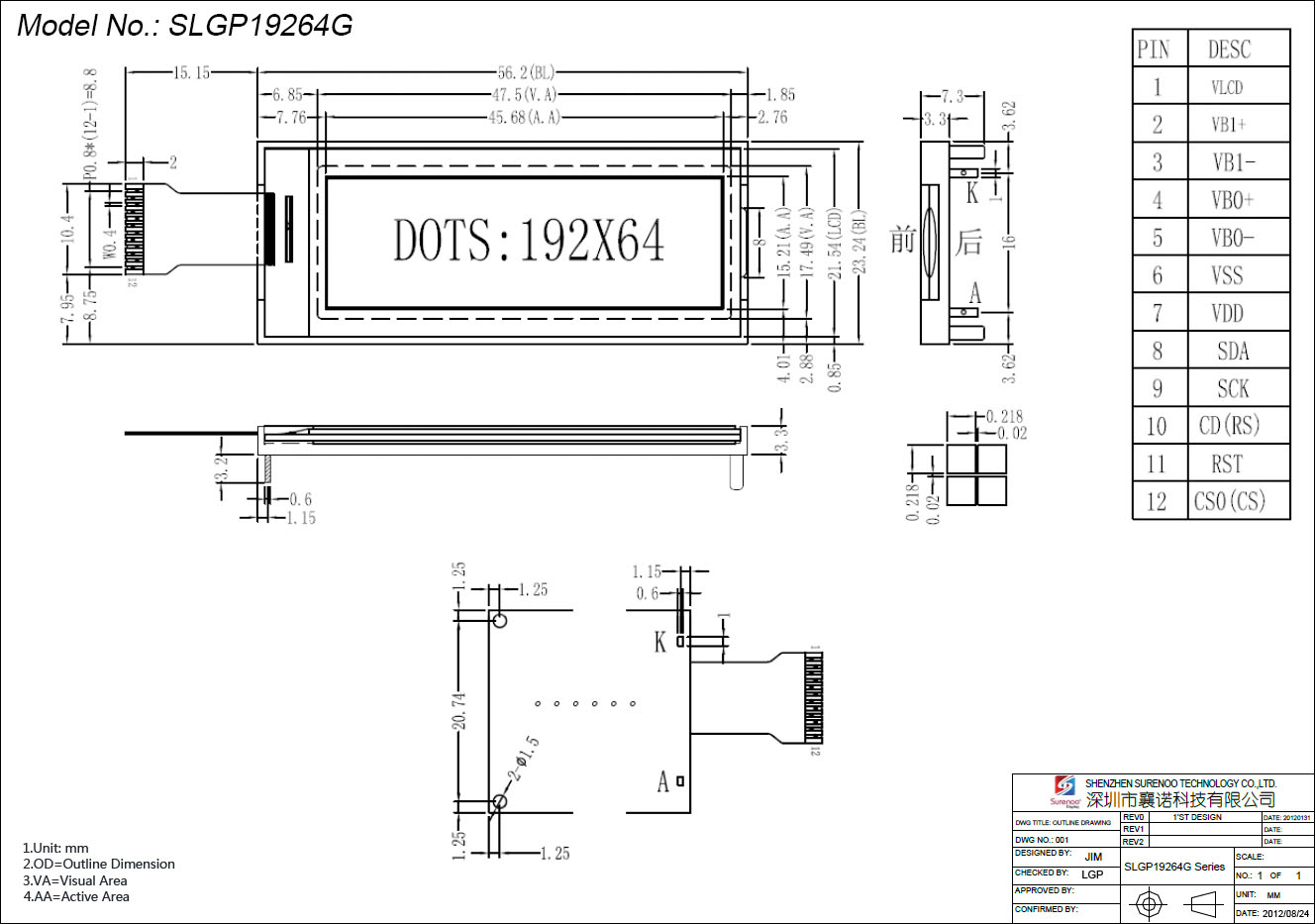 Gross Weight 0.024Kg Manufacturer Surenoo Display Type Graphic LCD Module Continuity Supply More than 10 years Part No. SLG19264G (2.0") Display Format 192*64 Dots Interface Serial SPI IC or Equivalent UC1604C or Equal Voltage 3.3V in default Connection 1X12P/2.0 Pin Header;