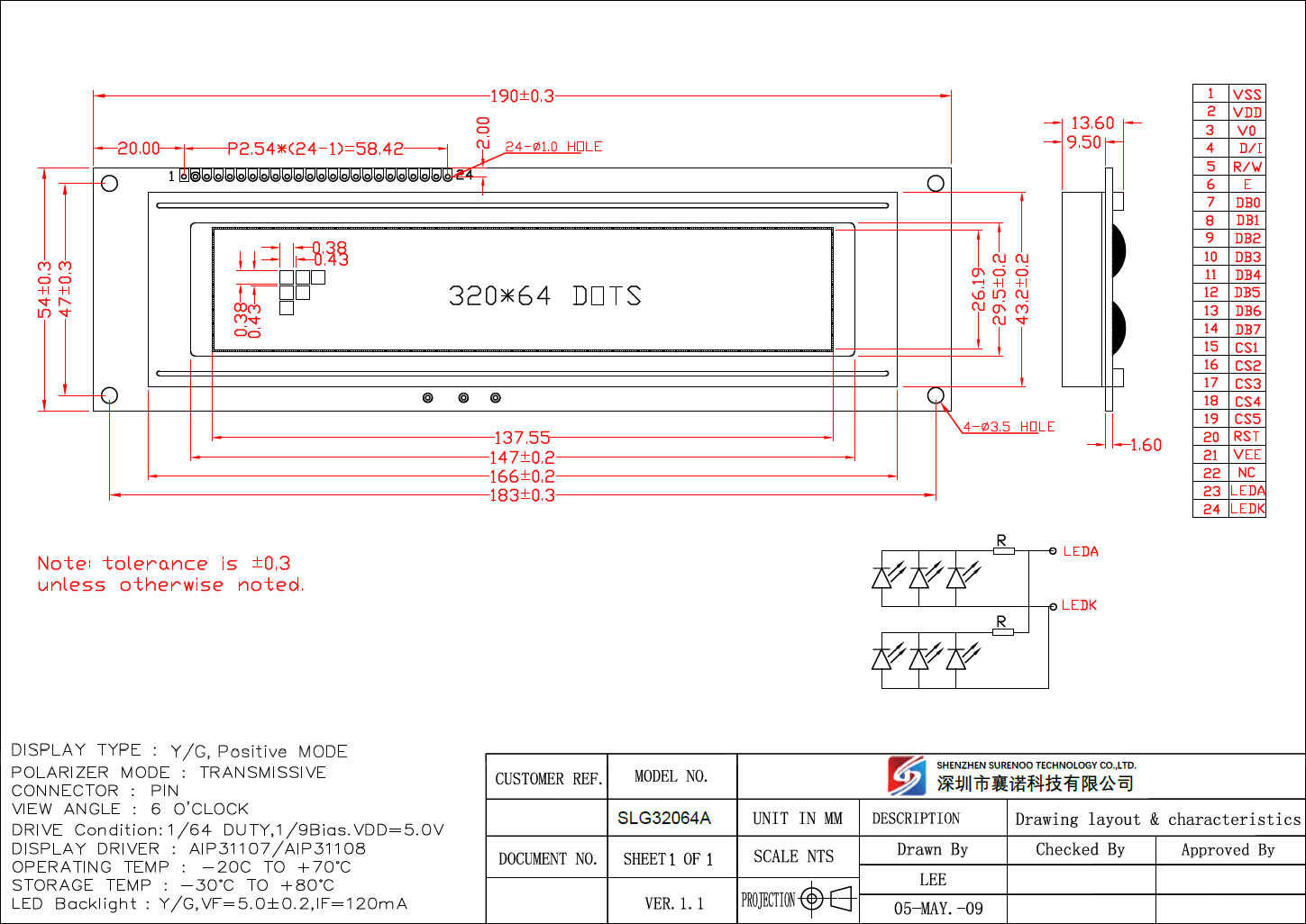 Gross Weight 0.200Kg Manufacturer Surenoo Display Type Graphic LCD Module Continuity Supply More than 10 years Part No. SLG32064A (5.5") Display Format 320*64 Dots Interface 6800 4/8-Bit Parallel IC or Equivalent KS0108, AIP31108 or Equal Voltage 5.0V in default Connection 1X24P/2.54 Pin Header Outline Dimension 190.00(W)x54.00(H)x13.60(T)mm Visual Area 149.00x29.50mm Active Area 137.55x26.19mm Display Type STN Yellow Green Backlight Type (LED) Yellow Green IC Package COB Viewing Direction 6:00 O'Clock Operating Temperature-20℃~70℃Storage Temperature-30℃~80℃- Outline Drawing