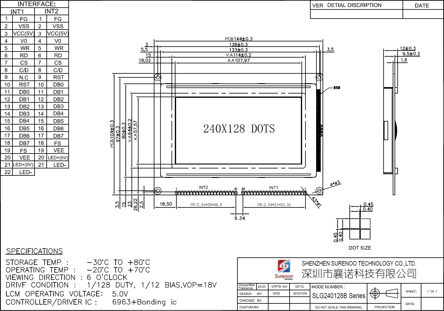 Gross Weight 0.200Kg Manufacturer Surenoo Display Type Graphic LCD Module Continuity Supply More than 10 years Part No. SLG240128B (4.7") Display Format 240*128 Dots Interface 8080 8-bit Parallel IC or Equivalent UCi6963 or Equal Voltage 5.0V in default Connection 1X21P/2.54 & 1X22/2.54 Pin Header Outline Dimension 144.00(W)x104.00(H)x12.00(T)mm Visual Area 114.00x64.00mm Active Area 107.96x57.56mm Display Type STN Yellow Green, STN Blue Negative, FSTN Positive Backlight Type (LED) Yellow Green, White IC Package COB Viewing Direction 6:00 O'Clock Operating Temperature-20℃~70℃Storage Temperature-30℃~80℃- Outline Drawing