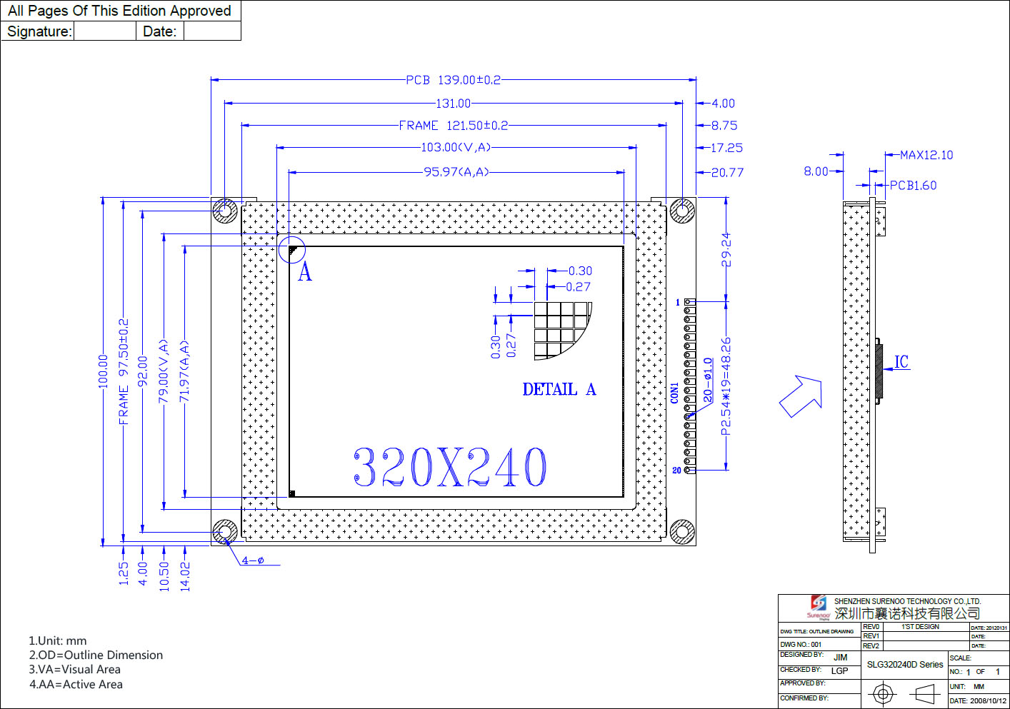SLG320240D Outline=139.00X100.00MM 5.1" inch 320240 320X240 320*240 Surenoo Graphic LCD Module Display Screen Panel 8080 6800 8-bit MPU Parallel RA8835 Controller STN Blue Negative FSTN Positive LED White Backlight