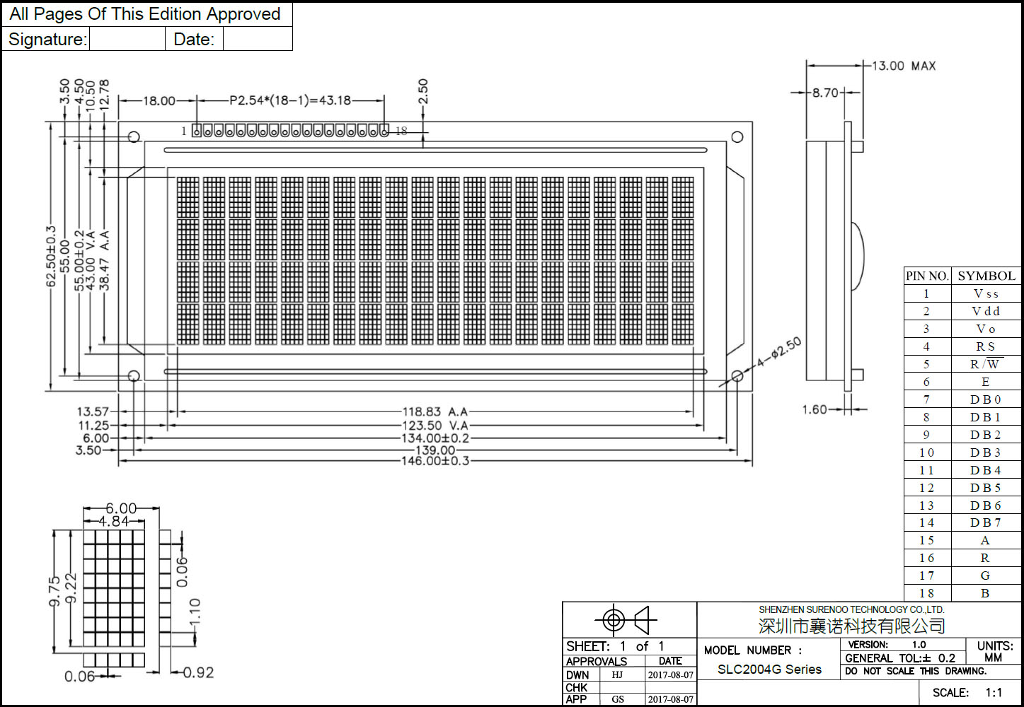 Gross Weight 0.120Kg Manufacturer Surenoo Display Type Character LCD Module Continuity Supply More than 10 years Part No. SLC2004G Display Format 20x4 Character Interface 6800 4-bit Parallel, 6800 8-bit Parallel IC or Equivalent AIP31066, ST7066 or Equal Fonts English-Japanese Voltage(Type) 5.0V in default Connection 1X18P/2.54 Pin Header Outline Dimension 146.00(W)x62.50(H)x13.00(T)mm Visual Area 123.50x43.00mm Active Area 118.83x38.47mm Display Type FSTN Positive Backlight Type (LED) RGB Backlight IC Package COB Viewing Direction 6:00 O'Clock Operating Temperature-20℃~70℃Storage Temperature-30℃~80℃- Outline Drawing