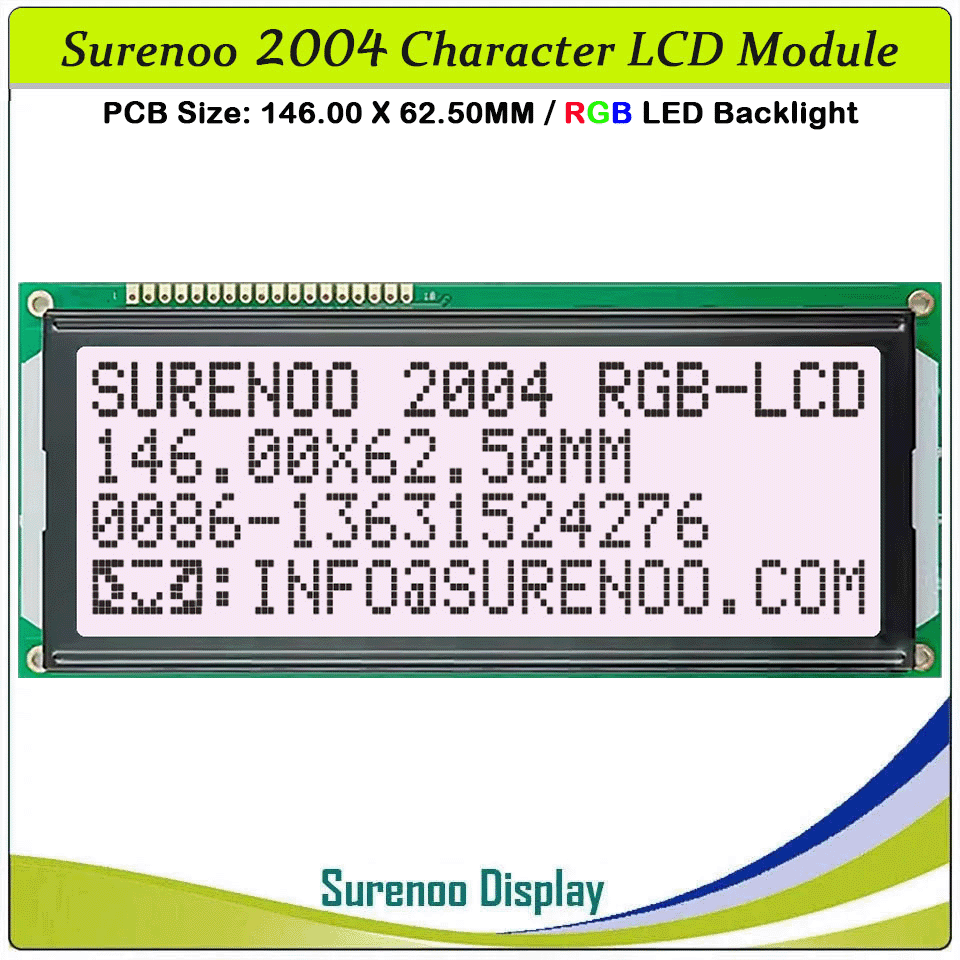 SLC2004G PCB=146.00X62.50MM 2004 20*4 Surenoo Character LCD Module Display Screen Panel 6800 4-bit 8-bit Parallel AIP31066 SPLC780D ST7066 Controller FSTN Positive with RGB LED Backlight