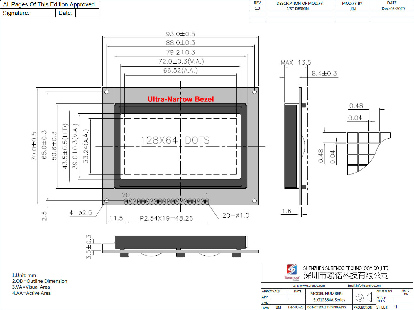 Gross Weight 0.080Kg Manufacturer Surenoo Display Type Graphic LCD Module Continuity Supply More than 10 years Part No. SLG12864A (3.0") Display Format 128*64 Dots Interface 6800 4/8-bit Parallel, Serial IIC, LCD2USB IC or Equivalent KS0108, AIP31108 or Equal Voltage 5.0V in default Connection 1X20P/2.54 Pin Header Outline Dimension 93.00(W)x70.00(H)x12.50(T)mm Visual Area 70.70x38.80mm Active Area 66.52x33.24mm Display Type STN Yellow Green, STN Blue Negative Backlight Type (LED) Yellow Green, White IC Package COB Viewing Direction 6:00 O'Clock Operating Temperature-20℃~70℃Storage Temperature-30℃~80℃- Outline Drawing