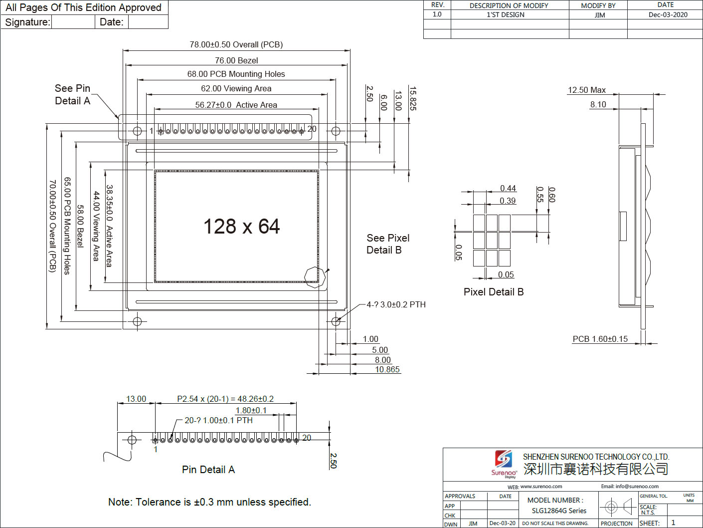 SLG12864G1 is a 128*64 Monochrome Graphic LCD Module, KS0108/AIP31108 Controller standard 20P/2.54 12864 parallel Graphic LCD Module.