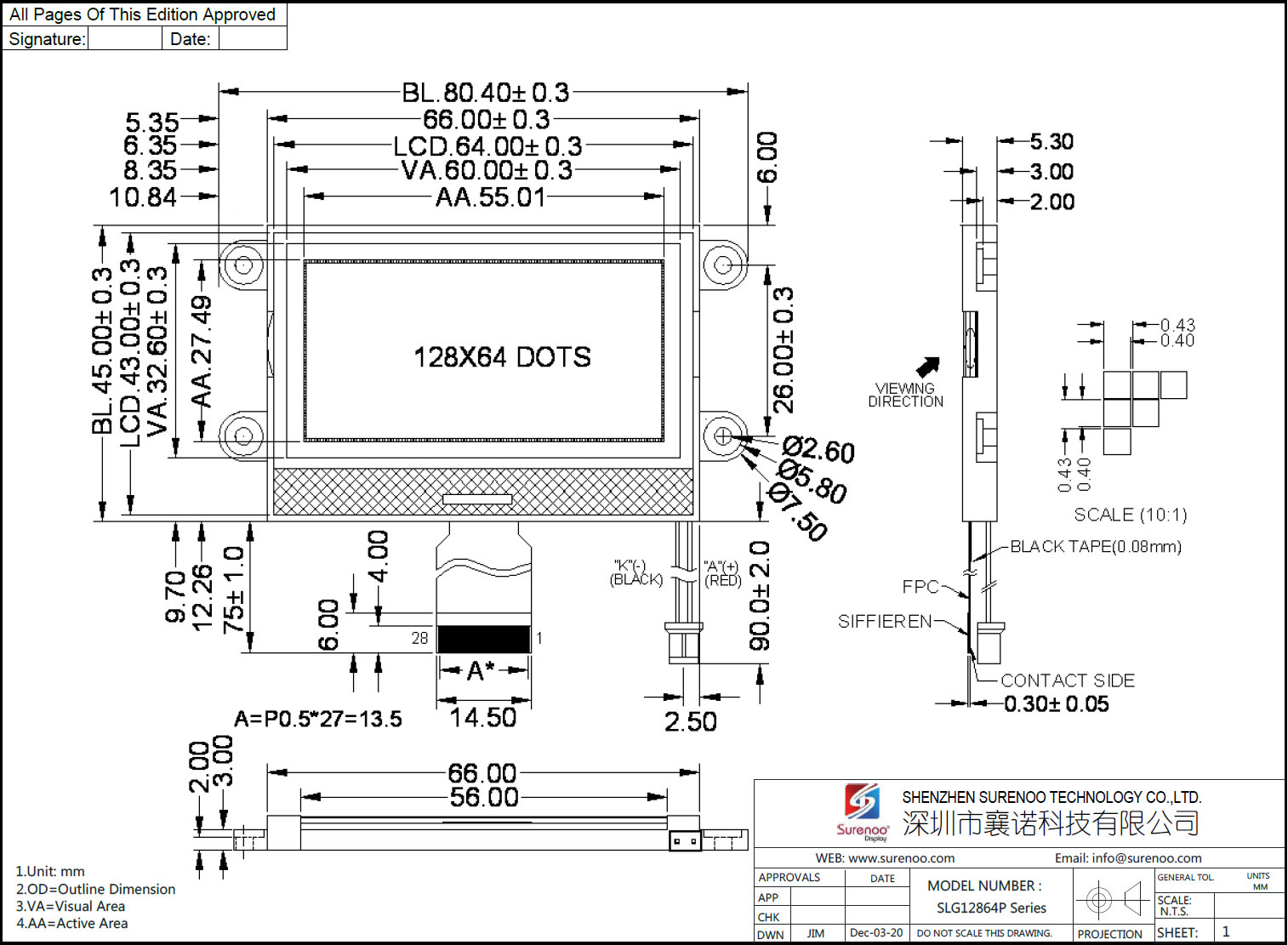 Gross Weight 0.040Kg Manufacturer Surenoo Display Type Graphic LCD Module Continuity Supply More than 10 years Part No. SLG12864P (2.42") Display Format 128*64 Dots Interface 8080 8-Bit Parallel IC or Equivalent NT7538 or Equal Voltage 3.3V in default Connection 1X28P/0.5 FPC & 2P/2.54 Connector Outline Dimension 80.40(W)x45.00(H)x5.30(T)mm Visual Area 60.00x32.60mm Active Area 55.01x27.49mm Display Type STN Yellow Green, STN Blue Negative, FSTN Positive Backlight Type (LED) Yellow Green, Orange, White IC Package COB Viewing Direction 6:00 O'Clock Operating Temperature-10℃~60℃Storage Temperature-20℃~70℃- Outline Drawing