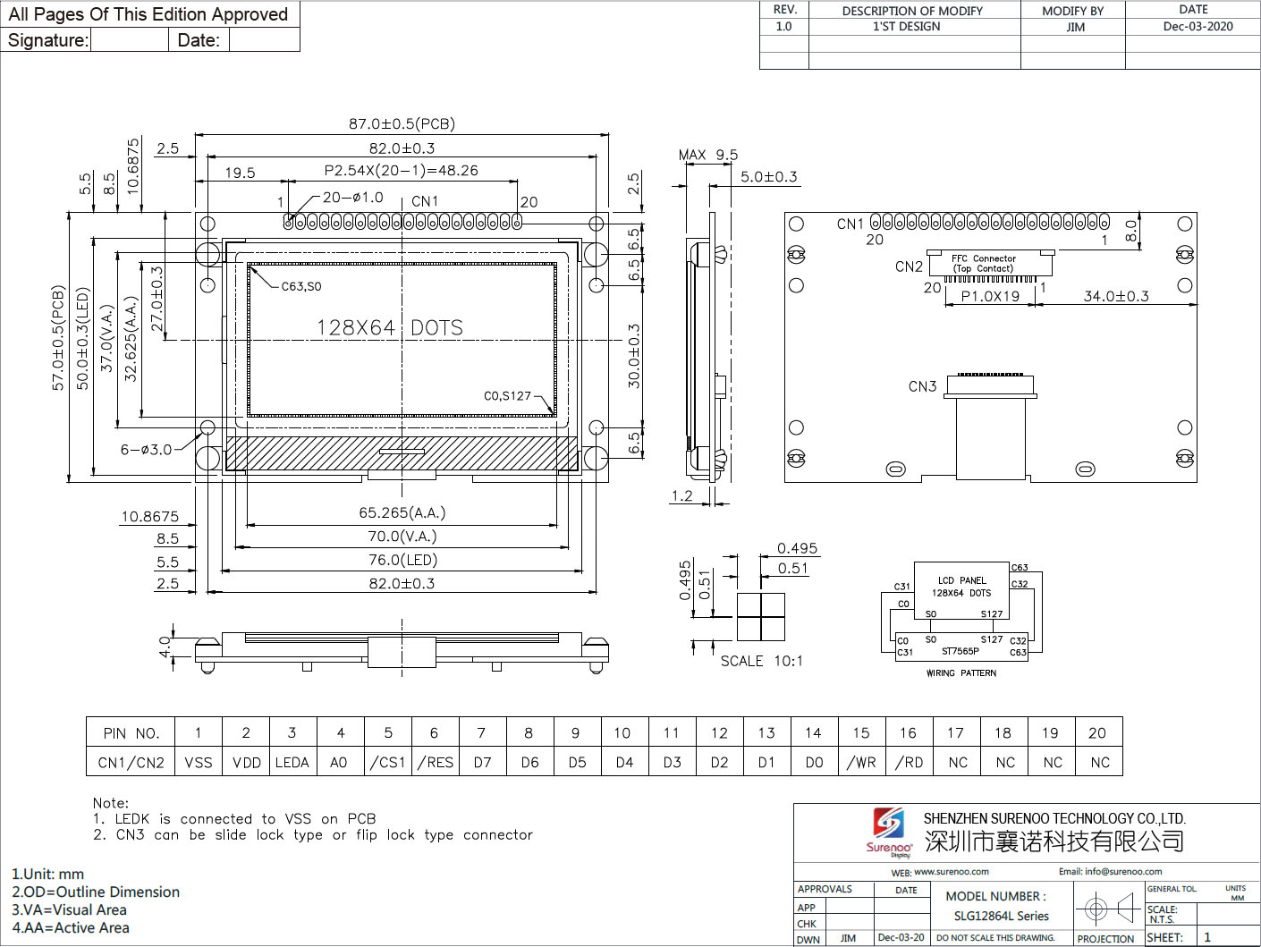 Gross Weight 0.080Kg Manufacturer Surenoo Display Type Graphic LCD Module Continuity Supply More than 10 years Part No. SLG12864L (2.9") Display Format 128*64 Dots Interface 8080 8-Bit Parallell, Serial SPI IC or Equivalent ST7565P or Equal Voltage 3.3V in default Connection 1X20P/2.54 Pin Header Outline Dimension 87.00(W)x57.00(H)x9.50(T)mm Visual Area 70.00x37.00mm Active Area 65.265x32.625mm Display Type STN Blue Negative, FSTN Positive, D-FSTN Negative Backlight Type (LED) White IC Package COG Viewing Direction 6:00 O'Clock Operating Temperature-20℃~70℃Storage Temperature-30℃~80℃- Outline Drawing