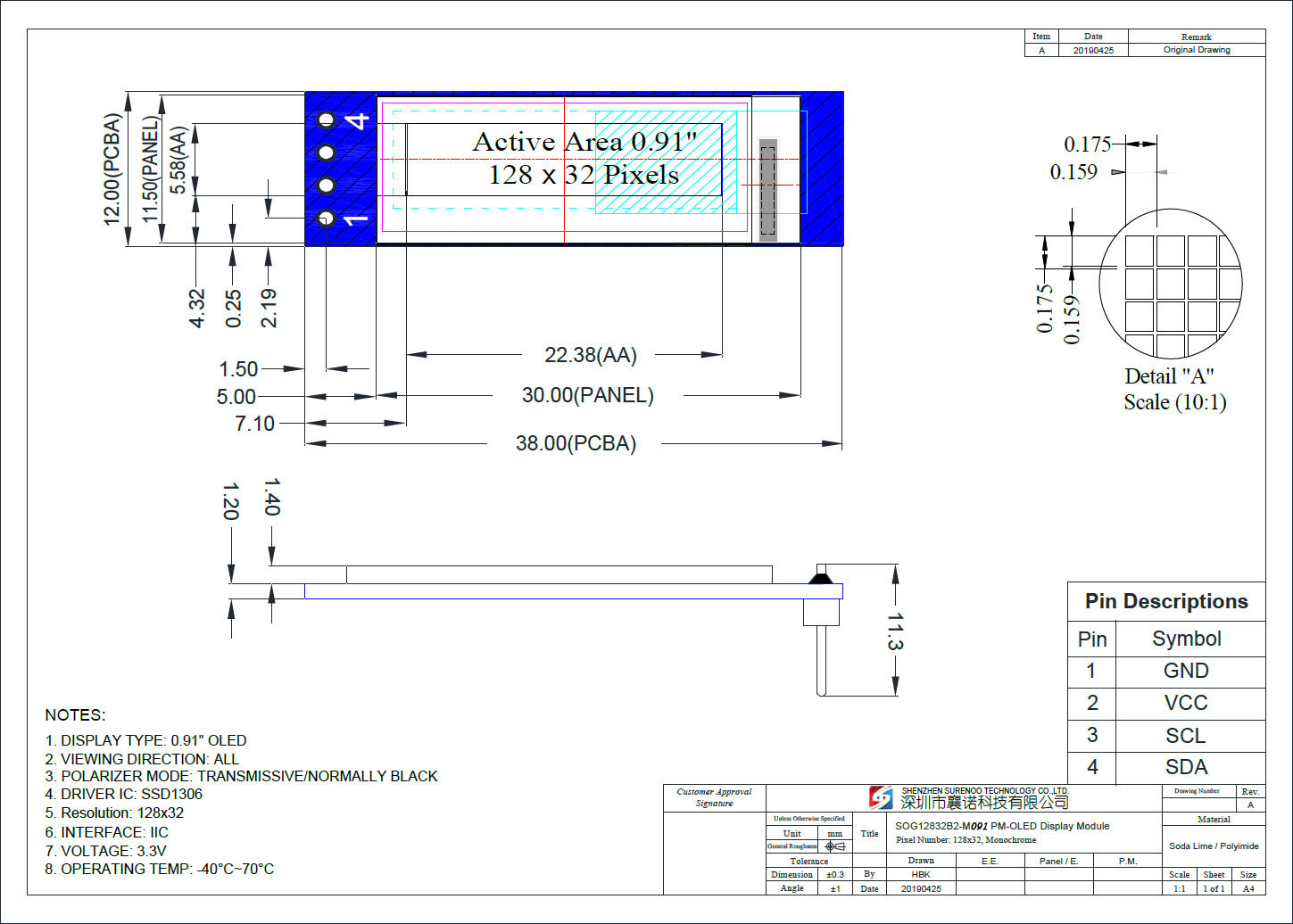 Gross Weight 0.020Kg Manufacturer Surenoo Display Type Graphic OLED Module / Graphic OLED Panel Continuity Supply More than 10 years Part No. SOG12832B Diagonal Size (Visual Area) 0.91" Display Format 128*32 Dots Interface SOG12832B1_M091, Serial SPI (7Pin/2.54 Pin Header) (OLED Module) SOG12832B2_M091, Serial IIC (4Pin/2.54 Pin Header) (OLED Module) SOG12832B1_P091, Serial SPI/IIC (14P/0.62 FPC) (OLED Panel) IC or Equivalent SSD1306 or Equal Voltage(Type) 3.3V Outline Dimension SOG12832B1_M091, 32.50(W)x20.50(H)x2.55(T)mm (OLED Module) SOG12832B2_M091, 38.00(W)x12.00(H)x2.55(T)mm (OLED Module) SOG12832B1_P091, 30.00(W)x11.50(H)x1.20(T)mm (OLED Panel) Visual Area 24.38x7.58mm Active Area 22.38x5.58mm Dots Size 0.159x0.159mm Dots Pitch 0.175x0.175mm Display Type PM-OLED Panel Colors Code White(SOGW) / Yellow(SOGY) / Blue(SOGB) IC Package COG Viewing Direction Full Viewing Angle Operating Temperature-40℃~70℃Storage Temperature-40℃~80℃- Outline Drawing