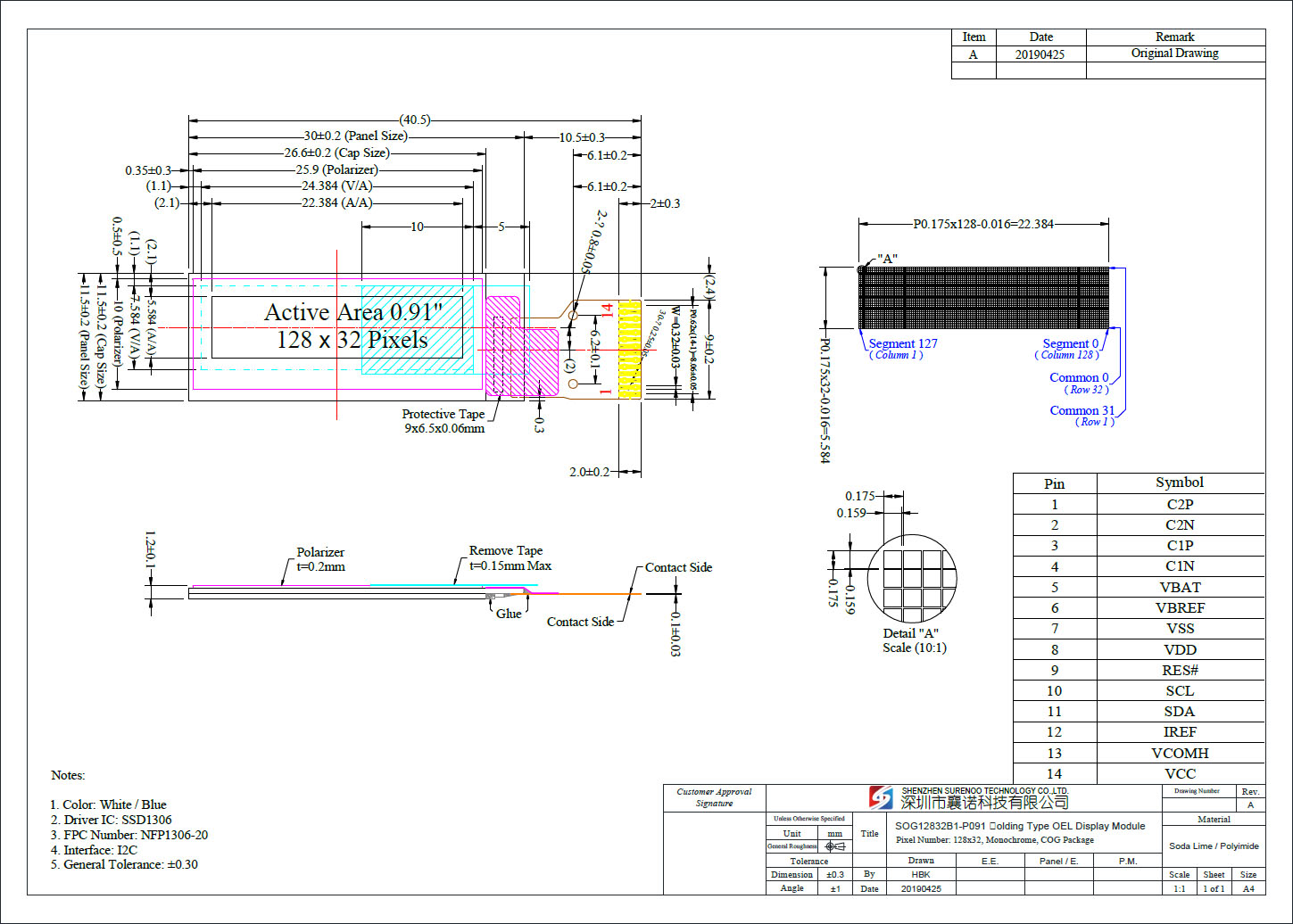 Gross Weight 0.020Kg Manufacturer Surenoo Display Type Graphic OLED Panel Continuity Supply More than 10 years Part No. SOG12832B1_P091 Diagonal Size (Visual Area) 0.91" Display Format 128*32 Dots Interface Serial SPI/IIC (14P/0.62 FPC) IC or Equivalent SSD1306 or Equal Voltage(Type) 3.3V Outline Dimension 30.00(W)x11.50(H)x1.20(T)mm Visual Area 24.38x7.58mm Active Area 22.38x5.58mm Dots Size 0.159x0.159mm Dots Pitch 0.175x0.175mm Display Type PM-OLED Panel Colors Code White(SOGW) / Yellow(SOGY) / Blue(SOGB) IC Package COG Viewing Direction Full Viewing Angle Operating Temperature-40℃~70℃Storage Temperature-40℃~80℃- Outline Drawing