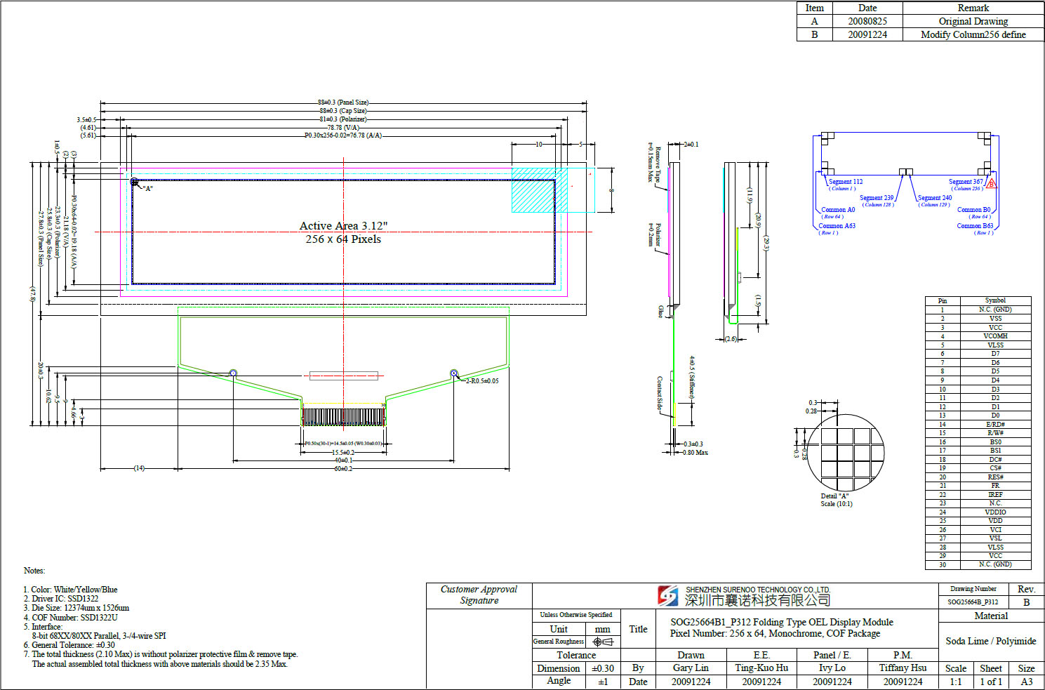 Gross Weight 0.080Kg Manufacturer Surenoo Display Type Graphic OLED Panel Continuity Supply More than 10 years Part No. SOG25664B1_P312 Diagonal Size (Visual Area) 3.12" Display Format 256*64 Dots Interface 8-bit 68XX/80XX Parallel, 3-/4-wire SPI IC or Equivalent SSD1322 or Equal Voltage(Type) 3.3V Outline Dimension 88.00(W)x27.80(H)x2.00(T)mm Visual Area 78.78x21.18mm Active Area 76.78x19.18mm Dots Size 0.30x0.30mm Dots Pitch 0.28x0.28mm Display Type PM-OLED Panel Colors Code SOGW(White) / Yellow(SOGY) / Blue(SOGB) IC Package COF Viewing Direction Full Viewing Angle Operating Temperature-40℃~70℃Storage Temperature-40℃~80℃- Outline Drawing (OLED Panel: SOG25664B1_P312)