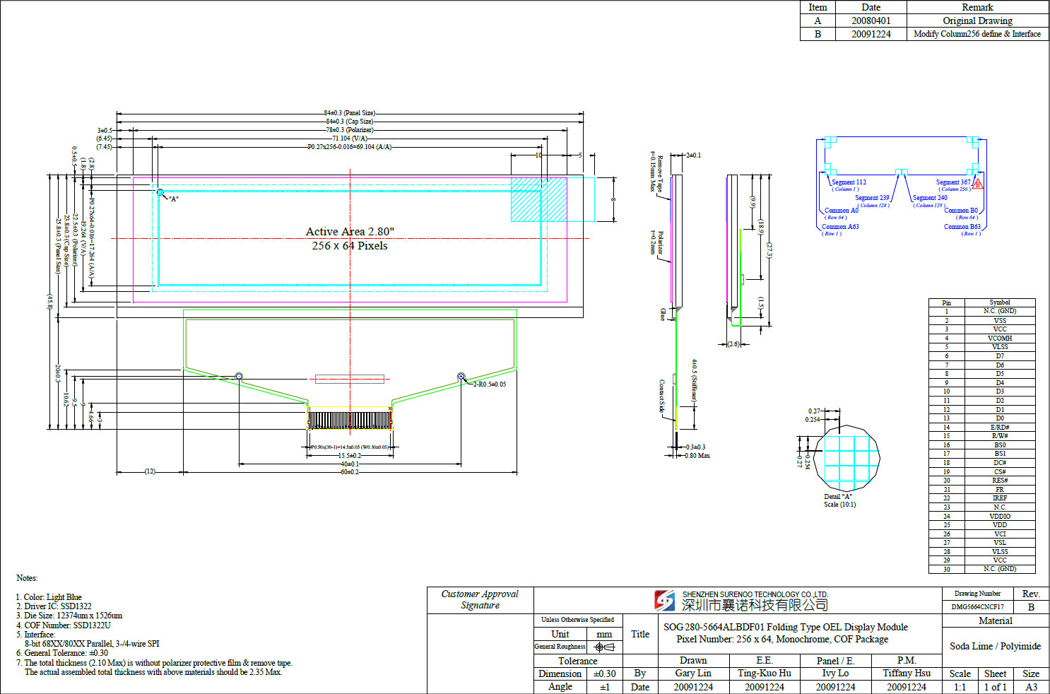 Gross Weight 0.060Kg Manufacturer Surenoo Display Type Graphic OLED Panel Continuity Supply More than 10 years Part No. SOG25664C_P280 Diagonal Size (Visual Area) 2.8" Display Format 256*64 Dots Interface 8-bit 68XX/80XX Parallel, 3-/4-wire SPI IC or Equivalent SSD1322 or Equal Voltage(Type) 3.3V Outline Dimension 84.00(W)x25.80(H)x2.00(T)mm Visual Area 71.104x19.264mm Active Area 69.104x17.264mm Dots Size 0.27x0.27mm Dots Pitch 0.254x0.254mm Display Type PM-OLED Panel Colors Code SOGW(White) / Green(SOGG) / Blue(SOGB) IC Package COF Viewing Direction Full Viewing Angle Operating Temperature-40℃~70℃Storage Temperature-40℃~80℃- Outline Drawing (OLED Panel: SOG25664C_P280)