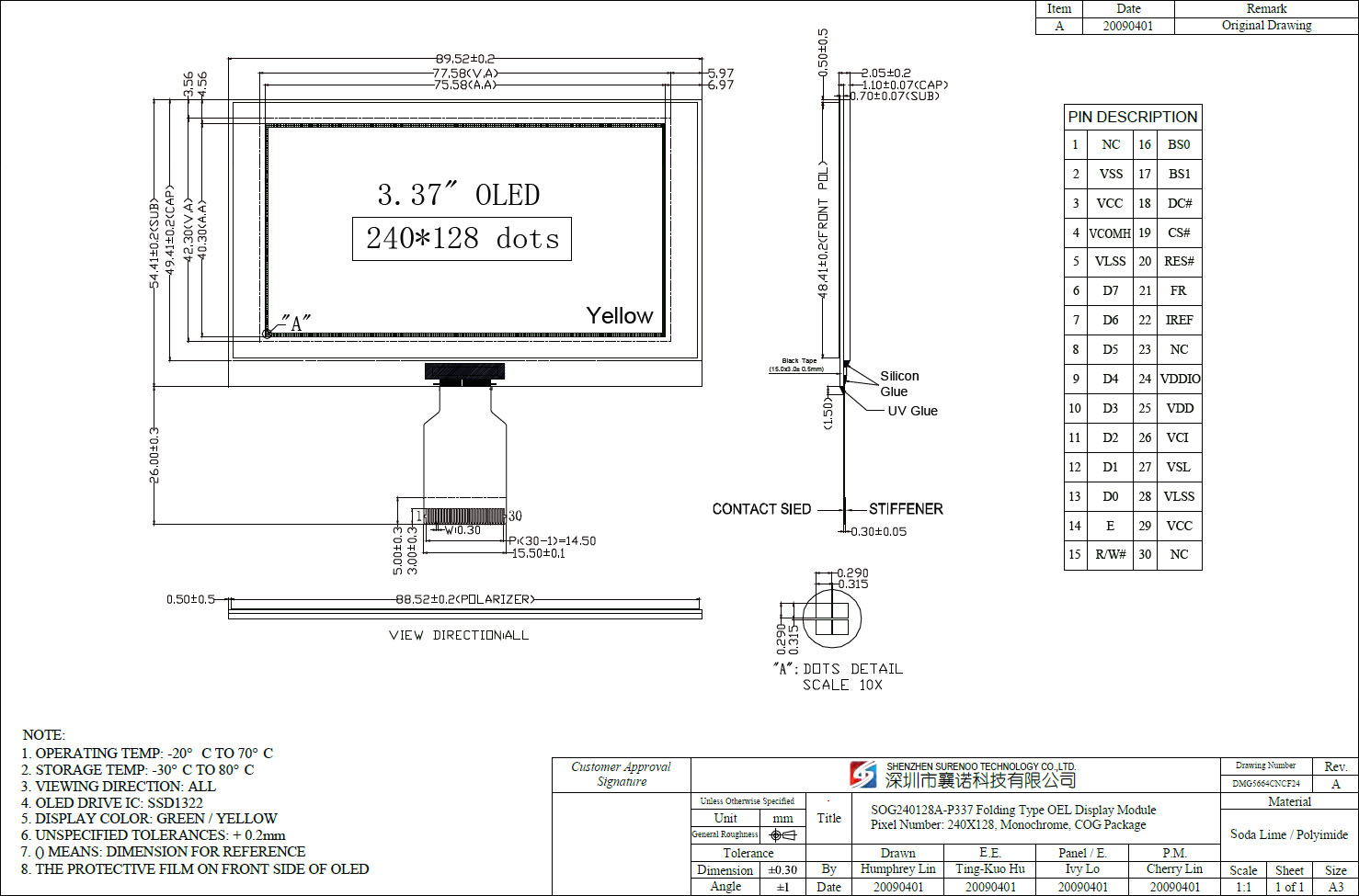 Gross Weight 0.080Kg Manufacturer Surenoo Display Type Graphic OLED Panel Continuity Supply More than 10 years Part No. SOG240128A Diagonal Size (Visual Area) 3.37" Display Format 240*128 Dots Interface 6800/8080 8-Bit Parallel, 3-/4- Wire Serial SPI IC or Equivalent SSD1322 or Equal Voltage(Type) 3.3V Outline Dimension 89.52(W)x54.41(H)x2.05(T)mm Visual Area 77.58x42.30mm Active Area 75.58x40.30mm Dots Size 0.290x0.290mm Dots Pitch 0.315x0.315mm Display Type PM-OLED Panel Colors Code Yellow(SOGY) / Green(SOGG) IC Package COG Viewing Direction Full Viewing Angle Operating Temperature-40℃~70℃Storage Temperature-40℃~80℃- Outline Drawing