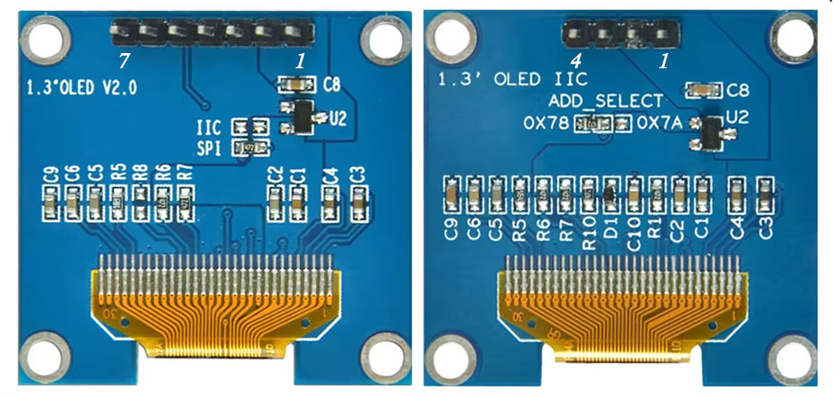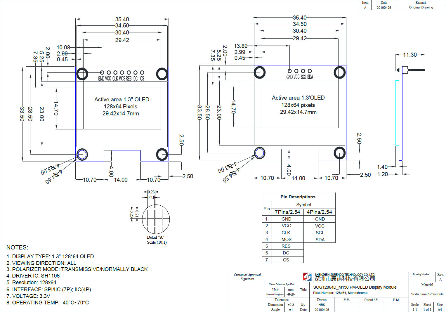 Gross Weight 0.020Kg Manufacturer Surenoo Display Type Graphic OLED Module / Graphic OLED Panel Continuity Supply More than 10 years Part No. SOG12864D_M130 Diagonal Size (Visual Area) 1.3" Display Format 128*64 Dots Interface 7P: Serial SPI / IIC; 4P: IIC IC or Equivalent SH1106 or Equal Voltage(Type) 3.3V Outline Dimension 35.40(W)x33.50(H)x2.60(T)mm Visual Area 31.42x16.70mm Active Area 29.42x14.70mm Dots Size 0.21x0.21mm Dots Pitch 0.23x0.23mm Display Type PM-OLED Panel Colors Code White(SOGW) / Blue(SOGB) IC Package COG Viewing Direction Full Viewing Angle Operating Temperature-40℃~70℃Storage Temperature-40℃~80℃- Outline Drawing