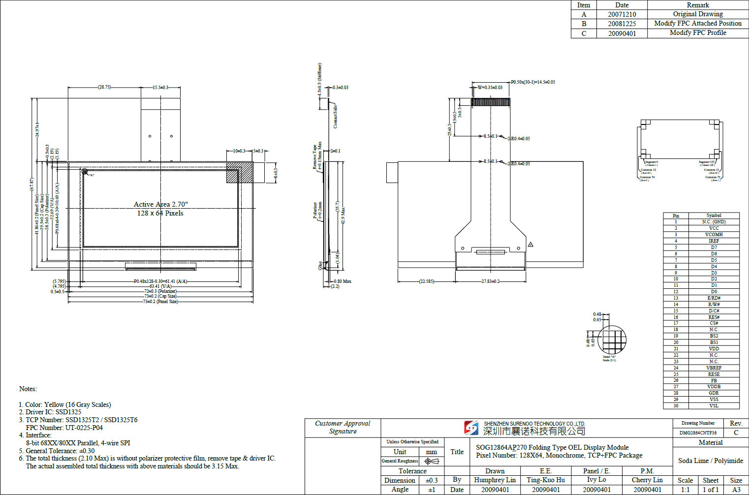 Gross Weight 0.060Kg Manufacturer Surenoo Display Type Graphic OLED Panel Continuity Supply More than 10 years Part No. SOG12864A_P270 Diagonal Size (Visual Area) 2.7" Display Format 128*64 Dots Interface SOG12864A_P270, 6800/8080 8-Bit Parallel, 4-Wire Serial SPI (30P/0.5 FPC) <OLED Panel> IC or Equivalent SSD1325 or Equal Voltage(Type) OLED Module: 3.3-5.0V; OLED Panel: 3.3V; Outline Dimension 73.00(W)x41.86(H)x2.20(T)mm Visual Area 63.41x32.69mm Active Area 61.41x30.69mm Dots Size 0.45x0.45mm Dots Pitch 0.48x0.48mm Display Type PM-OLED Panel Colors Code White(SOGW) / Yellow(SOGY) / Green(SOGG) IC Package COG Viewing Direction Full Viewing Angle Operating Temperature-40℃~70℃Storage Temperature-40℃~80℃- Outline Drawing