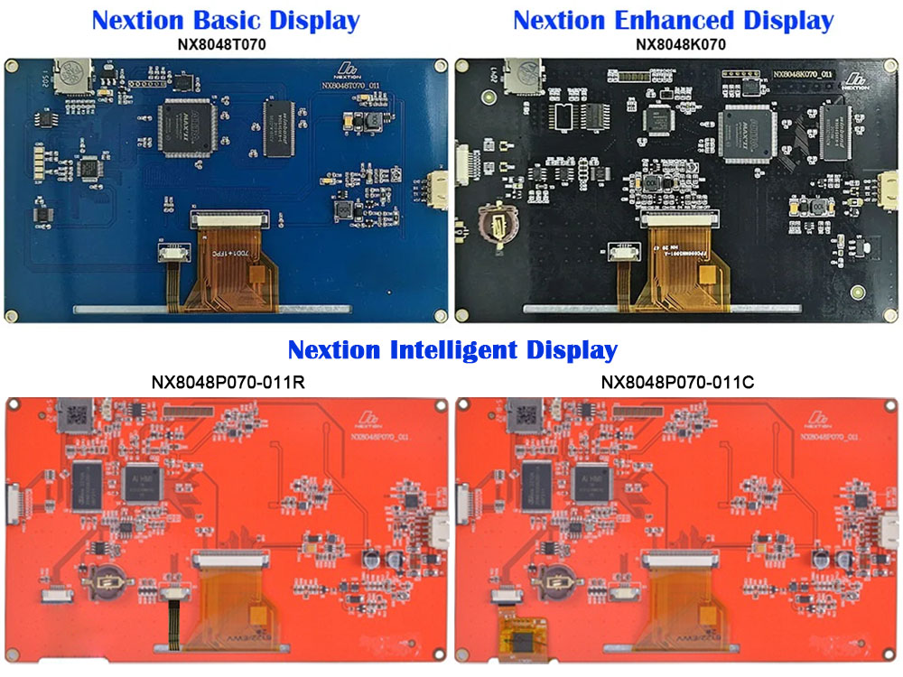 NRND = Not Recommended for New DesignBasic-NX8048T070 vs Enhanced-NX8048K070 vs Intelligent-NX8048P070-011R/C MODEL NAME NX8048T070 NX8048K070 NX8048P070-011R NX8048P070-011C Series Basic Enhanced Intelligent Intelligent Size 7.0″ 7.0″ 7.0″ 7.0″ Resolution 800*480 800*480 800*480 800*480 Touch Panel Resistive Resistive Resistive Capacitive Color 65536 65536 65536 65536 TTL Serial Voltages RX 3.3 / TX 3.3 RX 3.3 / TX 3.3 RX 3.3 / TX 3.3 RX 3.3 / TX 3.3 Flash 16 MB 32 MB 128 MB 128 MB SRAM 3584 Byte 8192 Byte 512KB 512KB MCU Speed 48 MHz 108 MHz 200 MHz 200 MHz EEPROM — 1024 Byte 1024 Byte 1024 Byte GPIOs — 8 Digital (4 PWM) 8 Digital (2 PWM) 8 Digital (2 PWM) RTC — Yes Yes Yes Runtime microSD — — √ √ Image Compression — — √ √ Audio/Video Resource — — √ √ New Components — — √ +11 Components √ +11 Components Hardware Graphics Assistance — — *.png/*.jpg/*.video transparency alpha-blending *.png/*.jpg/*.video transparency alpha-blending Price $79.9 USD $79.9 USD $69.9 USD $79.9 USD Conclusion NRND NRND Recommended Recommended