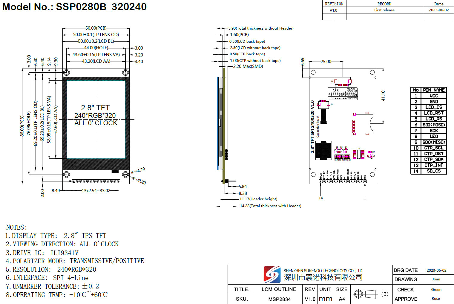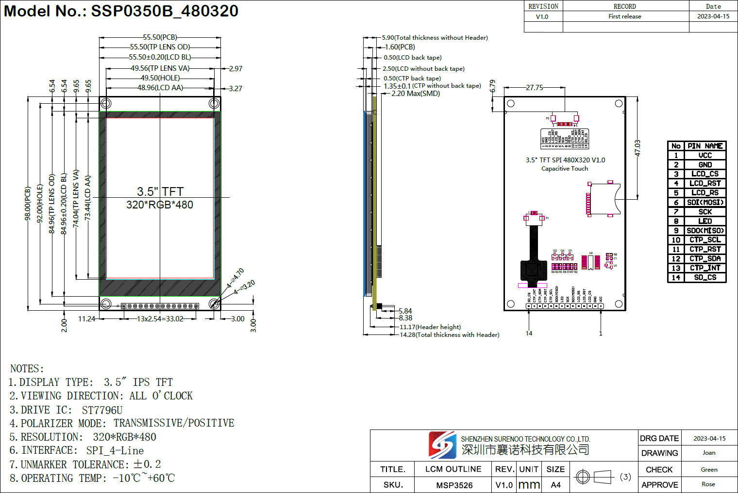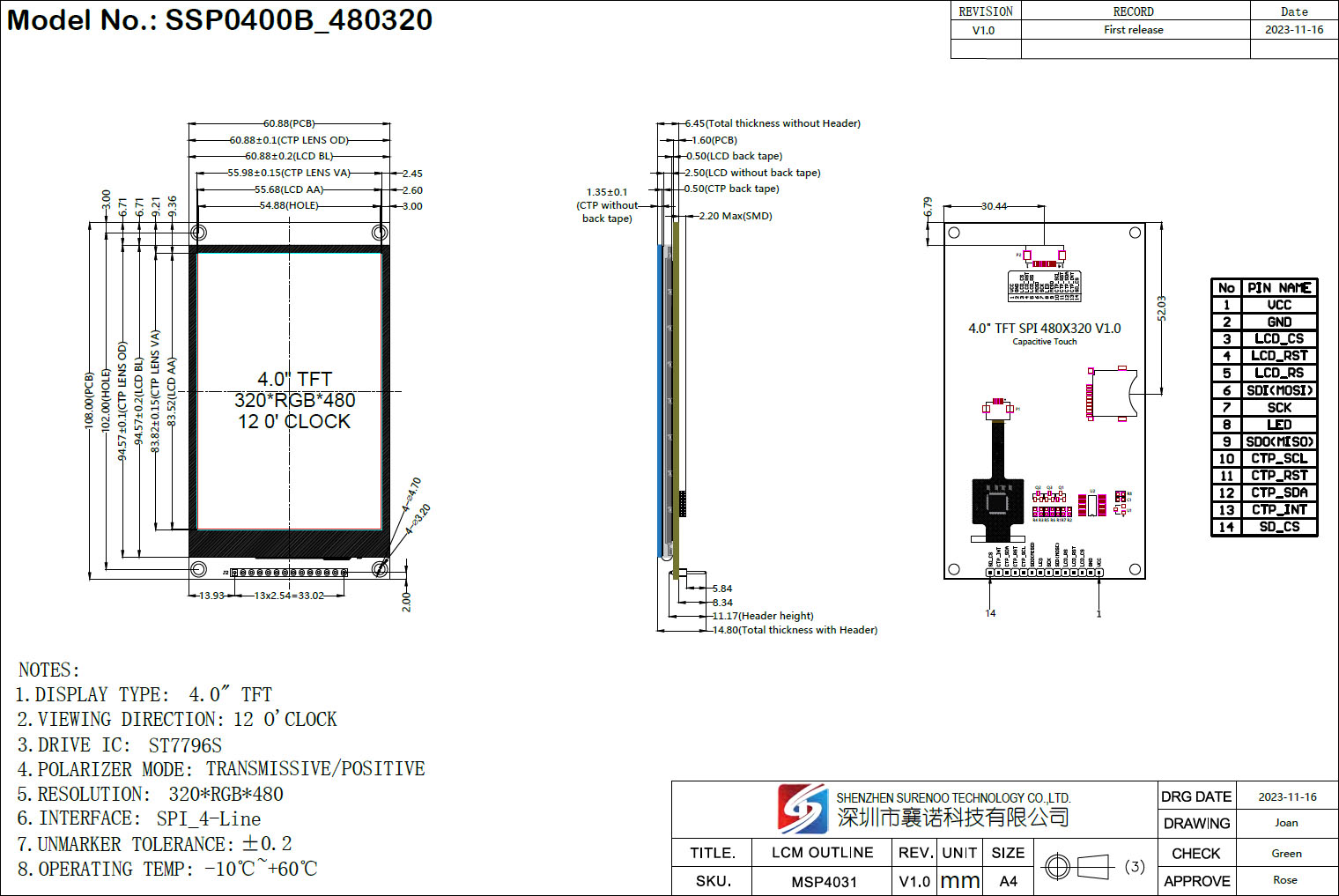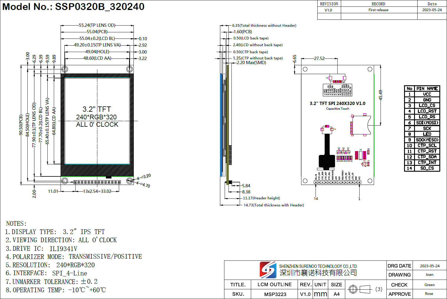 Surenoo 4.0-3.5-3.2-2.8 Inch Serial SPI Display Module TN Series, CTP & NTP is Optional for your design, It's standard 14P/2.54 Pin Header solder on Board.