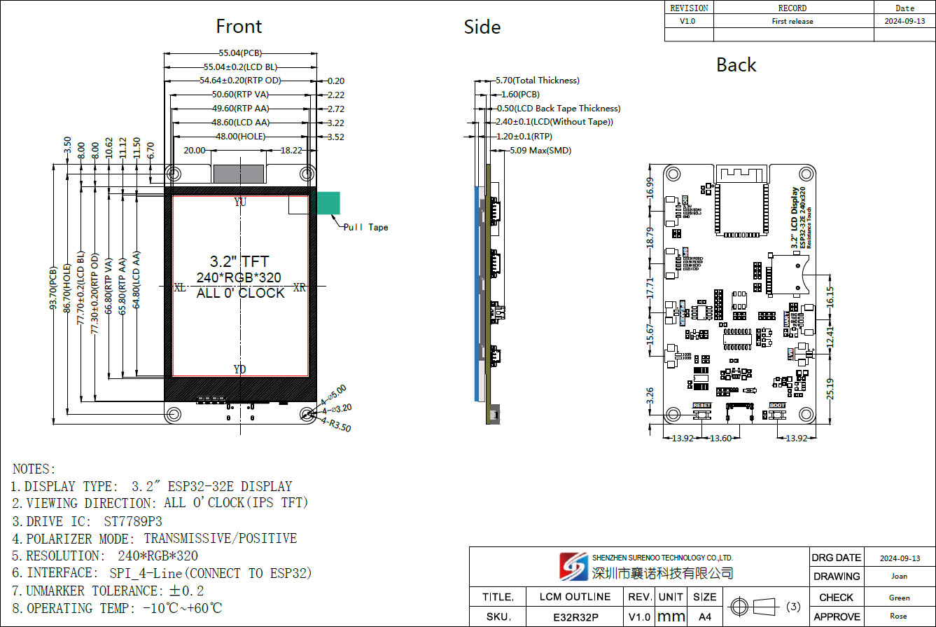 Item Description Display Color RGB 65K Color SKU ESP32-E32R32P Size 3.2 Inch Type TFT Controller ST7789 Resolution 240*320(Pixel) Module Size 55.04*93.70(mm) Effective Display Area 48.60*64.80(mm) View >178° (IPS Full Viewing Angle) Operating temperature -20℃~70℃ storage temperature -30℃~80℃ Operating Voltage 5.0V Datasheet LCD WIKI: http://www.lcdwiki.com/3.2inch_ESP32-32E_Display - Outline Drawing