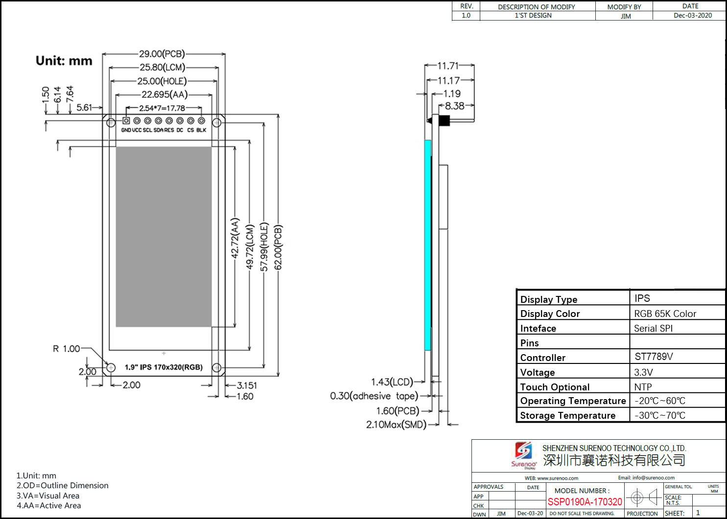 Model No.: 1.9" / 170*320 / SSP0190A-170320 / ST7789V