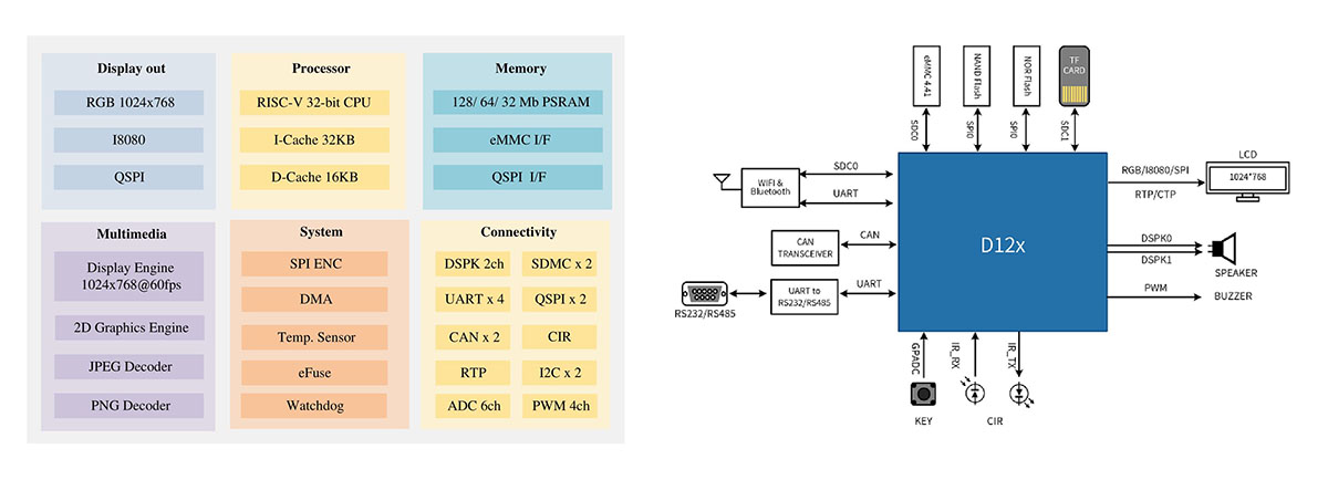 D12x is a domestically independent MCU family based on RISC-V with high performance, industrial full-HD and smart control.Equipped with a powerful 2D image accelerator, PNG decoder, JPEG decoder engine and various display interfaces, D12x is of high reliability and openness and provides wide industrial temperatures. It can be widely applied in industrial automation control, serial screen and other smart industry and smart home fields.
