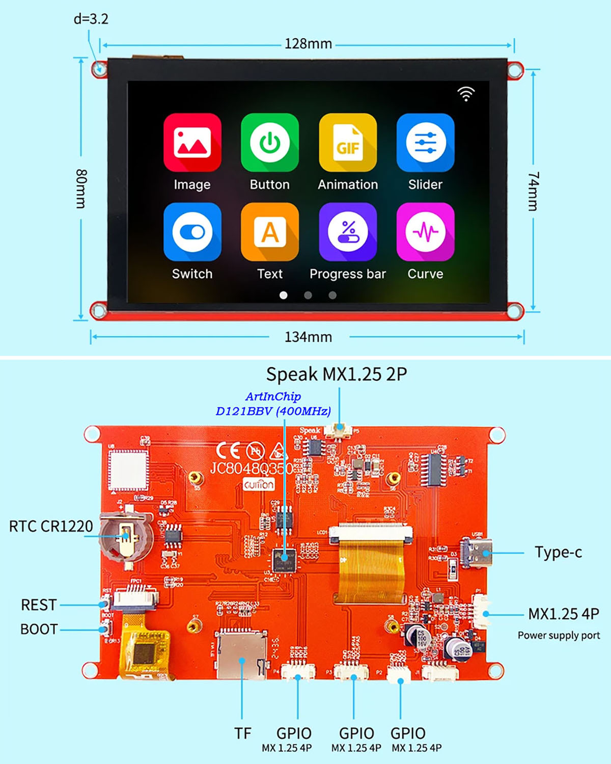 Rich peripheral interfaces and extended functions, plug and play, enable it to meet the needs of different fields.The GUITION JC8048Q350 monitor is a powerful HMI touch screen (capacitive touch screen is optional) with an 800*480 resolution LCD display. It uses a 400MHz chip as the main control processor, with optional WiFi and onboard RTC functions. It has audio and video capabilities and reserved multiple IO for users to use, with powerful performance and wide applications, suitable for IoT application devices and other human-machine interface display scenarios.This module includes a 5.0-inch LCD display and a driver board. In addition, the board also reserves TF card slots, multiple peripheral interfaces, Type-C interfaces, and speaker interfaces, providing more expansion possibilities. It supports the upper software development interface of GUITION, which can communicate with the user MCU through serial port. This allows developers to not only customize their own UI interface, but also quickly and easily create interesting projects, greatly shortening the development cycle.The GUITION JC8048Q350 monitor 5.0-inch module is suitable for various scenarios, such as automotive HMI, medical equipment, industrial control, power, civil electronics, automation, GPS, new energy, and IoT application devices. Its rich interface and extended functions enable it to meet the needs of different fields and provide users with more comprehensive solutions.- Product Parameters