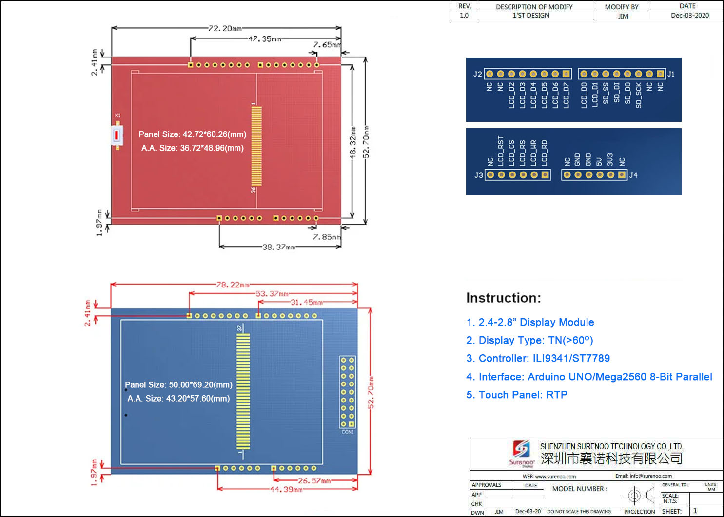 Item Parameter Manufacturer Surenoo Display Type Arduino Display Module Continuity Supply More than 10 years Model Details 2.4" / 240*320 / SAR0240A-240320 / ILI9341