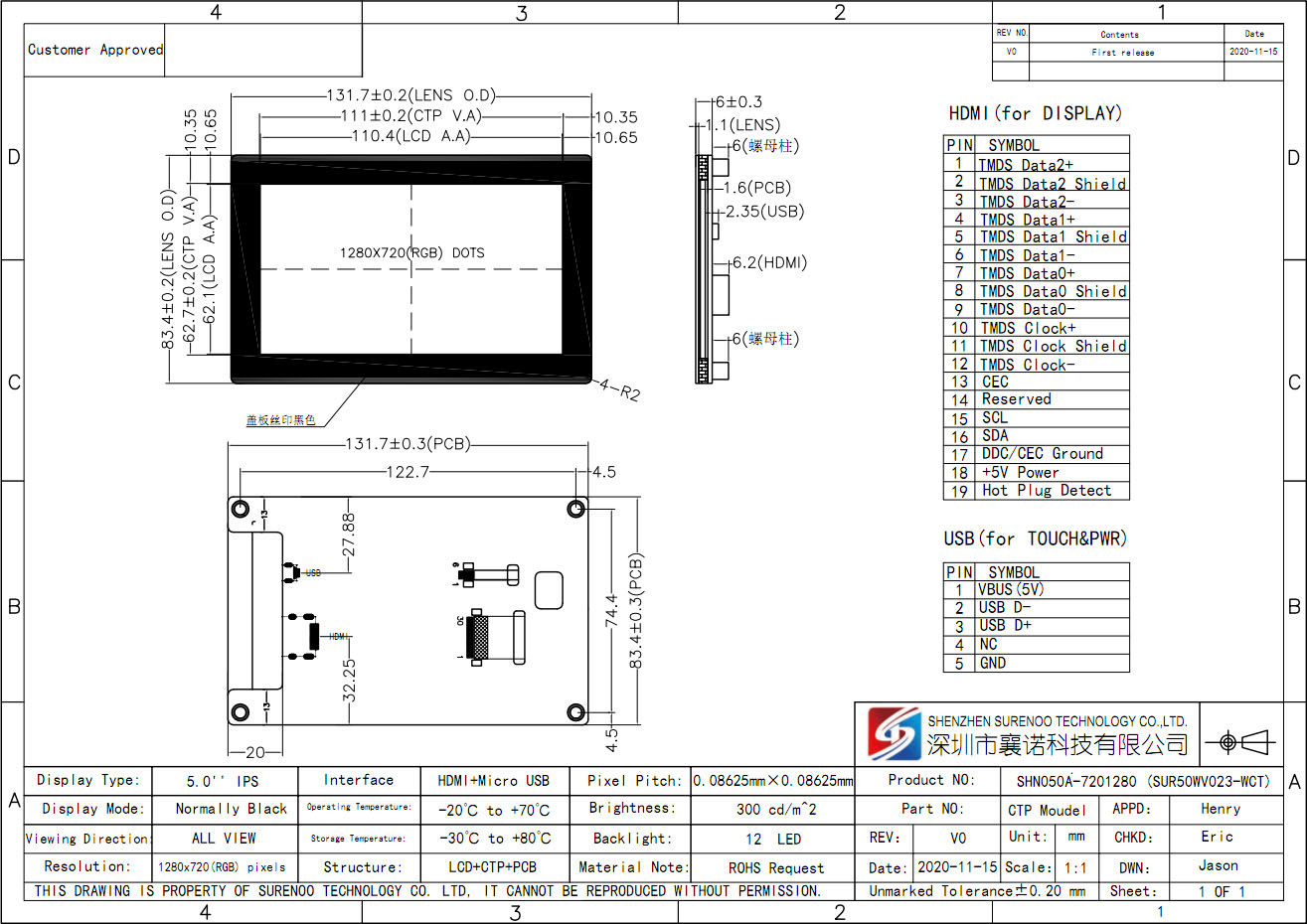 Item of General Information Contents Unit LCD Display Size (Diagonal) 5.0" Inch LCD Display Type TFT/TRANSMISSIVE - LCD Display Mode Normally Black - Recommended Viewing Direction ALL VIEW (IPS) O'Clock Model No. SHN050A-7201280 - Resolutions 720(RGB)*1280 - Video Input Interface HDMI - Power Supply Micro-USB 5.0V - Touch Type USB 5-Points Capacitive Touch Panel (CTP) - Consumption 2.40W (100%) - Backlight Type White LED - Luminance(TYP) 300 CD/M2 LCM Module Size (W×H×T) 83.40×131.70×12.20 MM Active Area (W×H) 62.10×110.40 MM