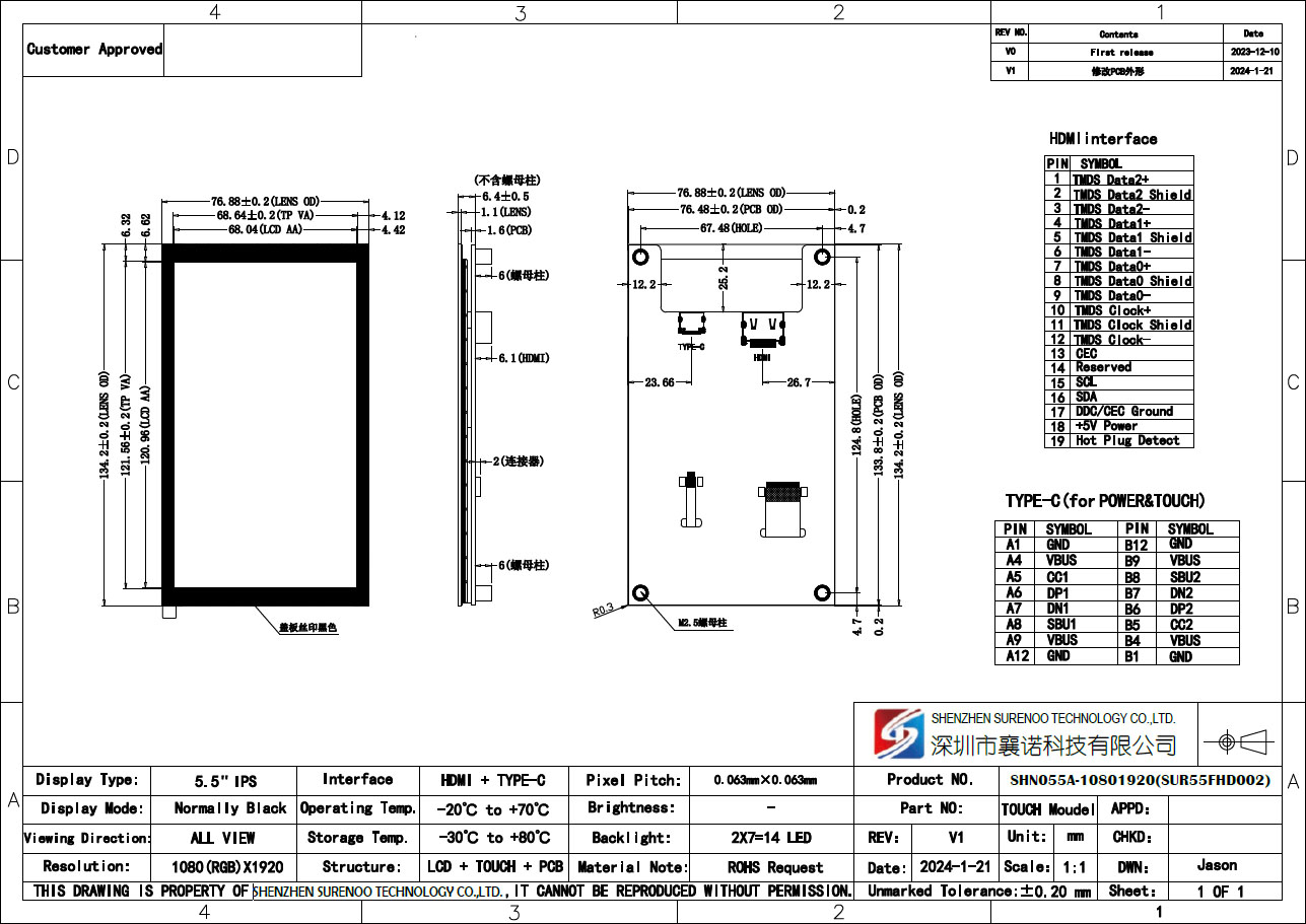 Item of General Information Contents Unit LCD Display Size (Diagonal) 5.5" Inch LCD Display Type TFT/TRANSMISSIVE - LCD Display Mode Normally Black - Recommended Viewing Direction ALL VIEW (IPS) O'Clock Model No. SHN055A-10801920 - Resolutions 1080(RGB)*1920 - Video Input Interface HDMI - Power Supply USB Type-C 5.0V - Touch Type USB 5-Points Capacitive Touch Panel (CTP) - Touch Controller GT911 - Backlight Type White LED - Luminance(TYP) 500 CD/M2 LCM Module Size (W×H×T) 76.88×134.20×12.50 MM Active Area (W×H) 68.04×120.96 MM