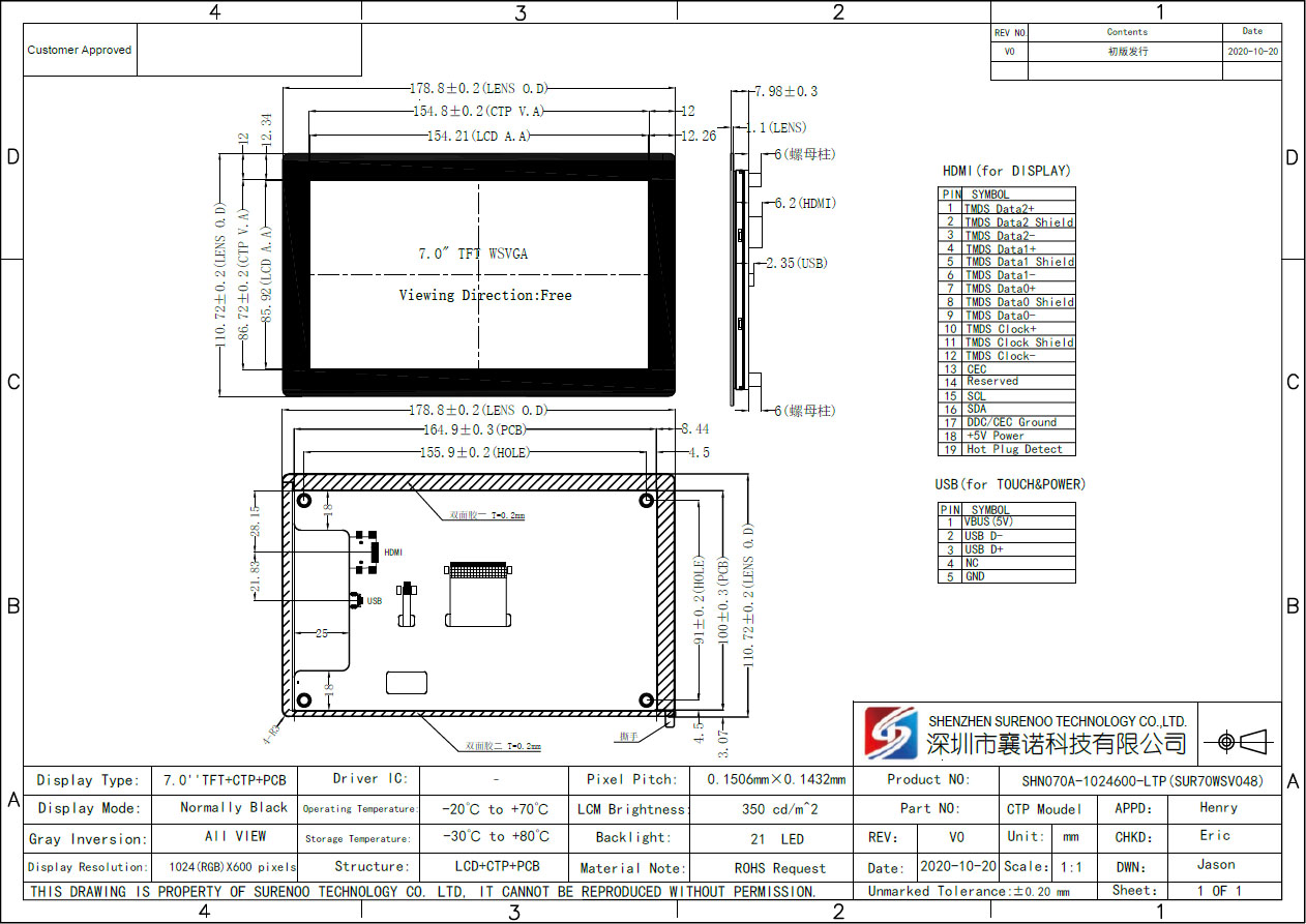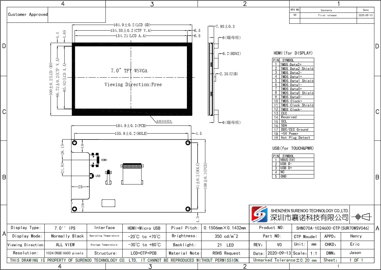 Item of General Information Contents Unit LCD Display Size (Diagonal) 7.0" Inch LCD Display Type TFT/TRANSMISSIVE - LCD Display Mode Normally Black - Recommended Viewing Direction ALL VIEW (IPS) O'Clock Model No. SHN070A-1024600-(CTP/LTP) - Resolutions 1024(RGB)*600 - Video Input Interface HDMI - Power Supply Micro USB 5.0V - Touch Type USB 5-Points Capacitive Touch Panel (CTP) - Backlight Type White LED - Luminance(TYP) 350 LUM LCM Module Size (W×H×T) CTP: 164.90×100.00×14.33 / LTP: 178.80×110.72×14.33 MM Active Area (W×H) 154.21×85.92 MM