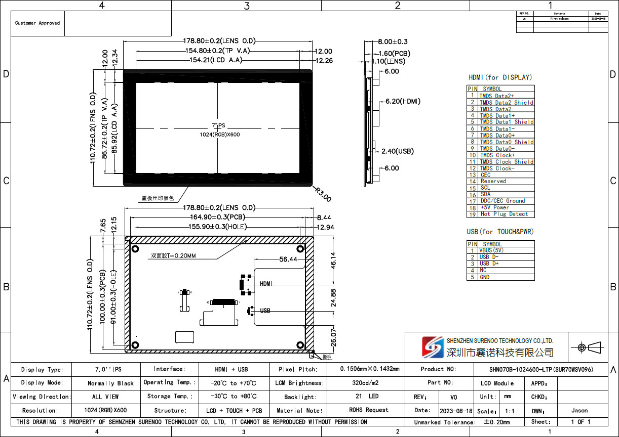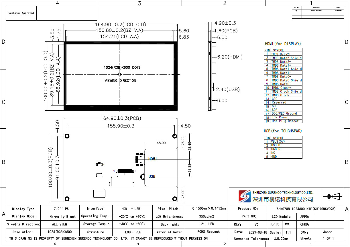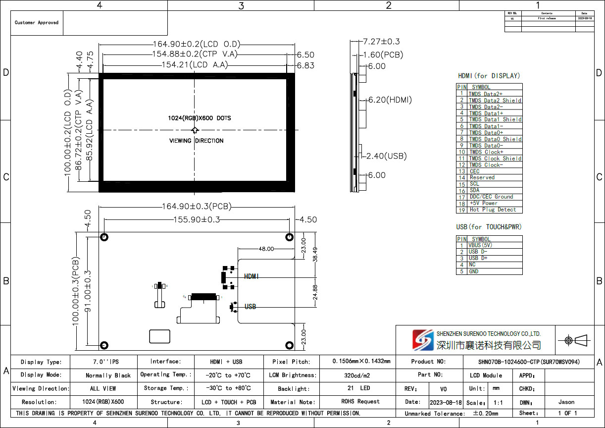 Item of General Information Contents Unit LCD Display Size (Diagonal) 7.0" IPS Inch LCD Display Type TFT/TRANSMISSIVE - LCD Display Mode Normally Black - Recommended Viewing Direction ALL VIEW (IPS) O'Clock Model No. SHN070B-1024600-(CTP/NTP/LTP) - Resolutions 1024(RGB)*600 - Video Input Interface HDMI - Power Supply Micro USB 5.0V - Touch Type USB 5-Points Capacitive Touch Panel (CTP/LTP) or Without Touch (NTP) - Backlight Type White LED - Luminance(TYP) NTP: 350 / CTP, LTP: 320 LUM LCM Module Size (W×H×T) CTP: 164.90×100.00×14.33 / NTP: 164.90×100.00×11.10 / LTP: 178.80×110.72×14.33 MM Active Area (W×H) 154.21×85.92 MM