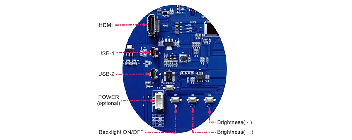 HDMI: Video Display Interface;USB-1: Touch and Power Interface, also required for touch free products to be connected to this interface for power supply;USB-2 / POWER: Power supply interface, can choose one to use; When using USB-2 power supply, the brightness of the product can be adjusted in ten levels by pressing buttons K3 and K4; When using the POWER interface for power supply, the brightness of the product can be adjusted through software PWM signals.