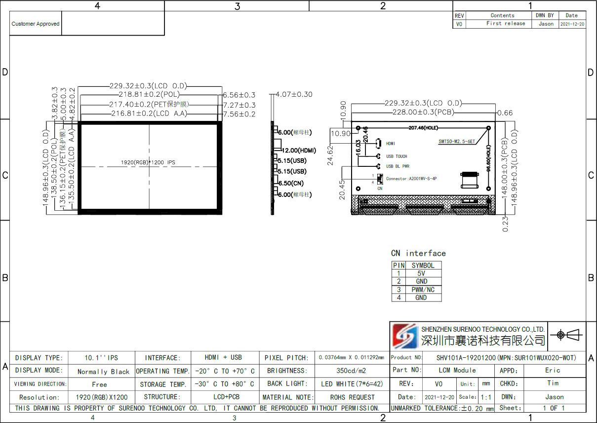 Item of General Information Contents Unit LCD Display Size (Diagonal) 10.1" Inch LCD Display Type TFT/TRANSMISSIVE - LCD Display Mode Normally Black - Recommended Viewing Direction ALL VIEW (IPS) O'Clock Model No. SHV101A-19201200 - Resolutions 1920(RGB)*1200 - Video Input Interface Vertial-HDMI Type A - Power Supply Micro-USB 5.0V - Touch Type Micro-USB 5-Points Capacitive Touch Panel (CTP) - Touch Controller - - Backlight Type White LED - Luminance(TYP) LTP: 300 / NTP: 350 CD/M2 LCM Module Size (W×H×T) LTP: 255.00×172.60×19.14 / NTP: 229.32×148.96×16.07 MM Active Area (W×H) 256.32×144.18 MM