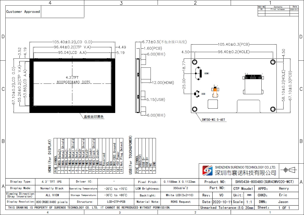 Item of General Information Contents Unit LCD Display Size (Diagonal) 4.3" Inch LCD Display Type TFT/TRANSMISSIVE - LCD Display Mode Normally Black - Recommended Viewing Direction ALL VIEW (IPS) O'Clock Model No. SHV043A-800480 - Resolutions 1024(RGB)*600 - Video Input Interface Vertial-HDMI Type A - Power Supply Micro-USB 5.0V - Touch Type Micro-USB 5-Points Capacitive Touch Panel (CTP) - Touch Controller - - Backlight Type White LED - Luminance(TYP) 350 CD/M2 LCM Module Size (W×H×T) LTP: 178.80×110.72 / CTP: 164.90×100.00 MM Active Area (W×H) 154.21×85.92 MM