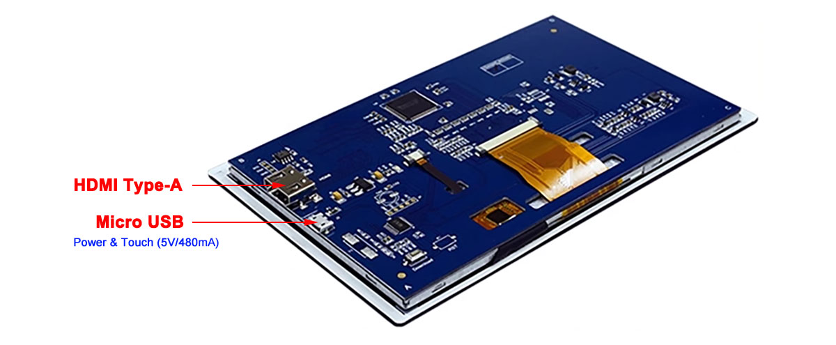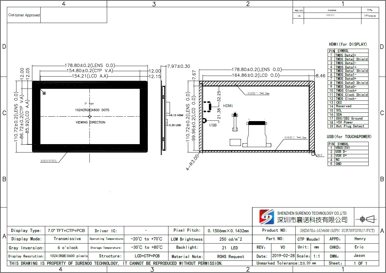 Item of General Information Contents Unit LCD Display Size (Diagonal) 7.0" Inch LCD Display Type TFT/TRANSMISSIVE - LCD Display Mode Normally White - Recommended Viewing Direction TN 6:00 O'Clock Model No. SHD070A-1024600-LTP - Resolutions 1024(RGB)*600 - Video Input Interface HDMI - Power Supply Micro USB 5.0V - Touch Type USB 5-Points Large Capacitive Touch Panel (LTP) - Backlight Type White LED - Luminance(TYP) 250 LUM LCM Module Size (W×H×T) 178.80×110.72×7.97 MM Active Area (W×H) 154.21×85.92 MM